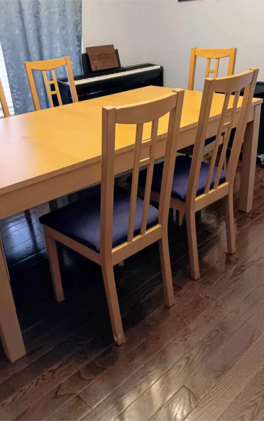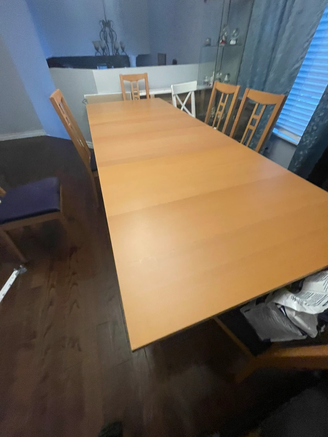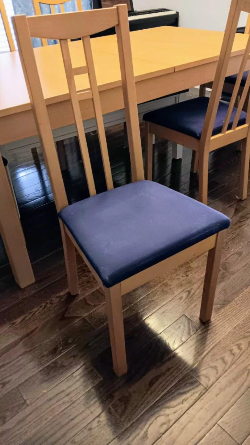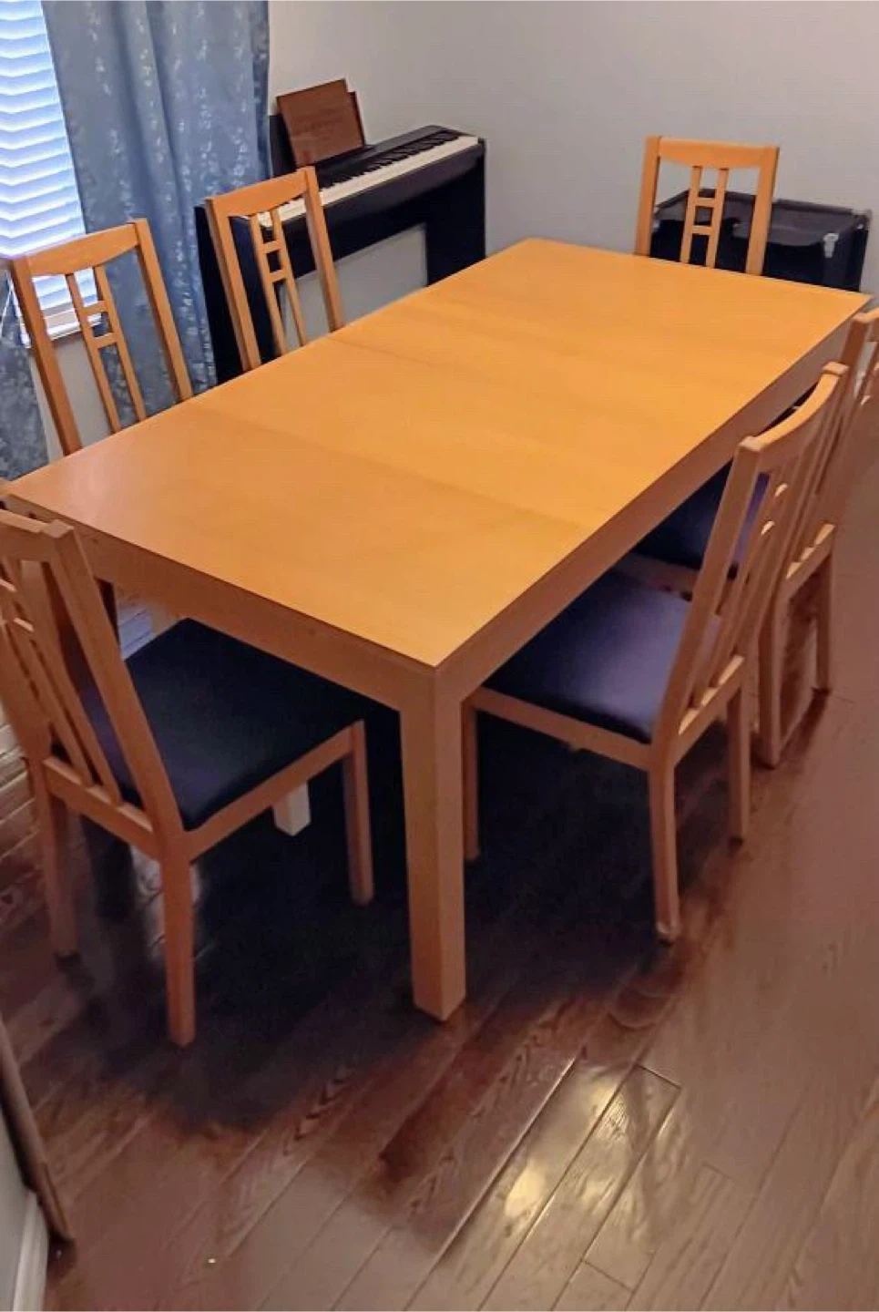 Selling a dining table with six chairs. The table is a light wood colour, and the chairs have navy blue cushions. It's in great condition and ready for a new home! 69 in x 38.5 when closed. and 102 when fully opened