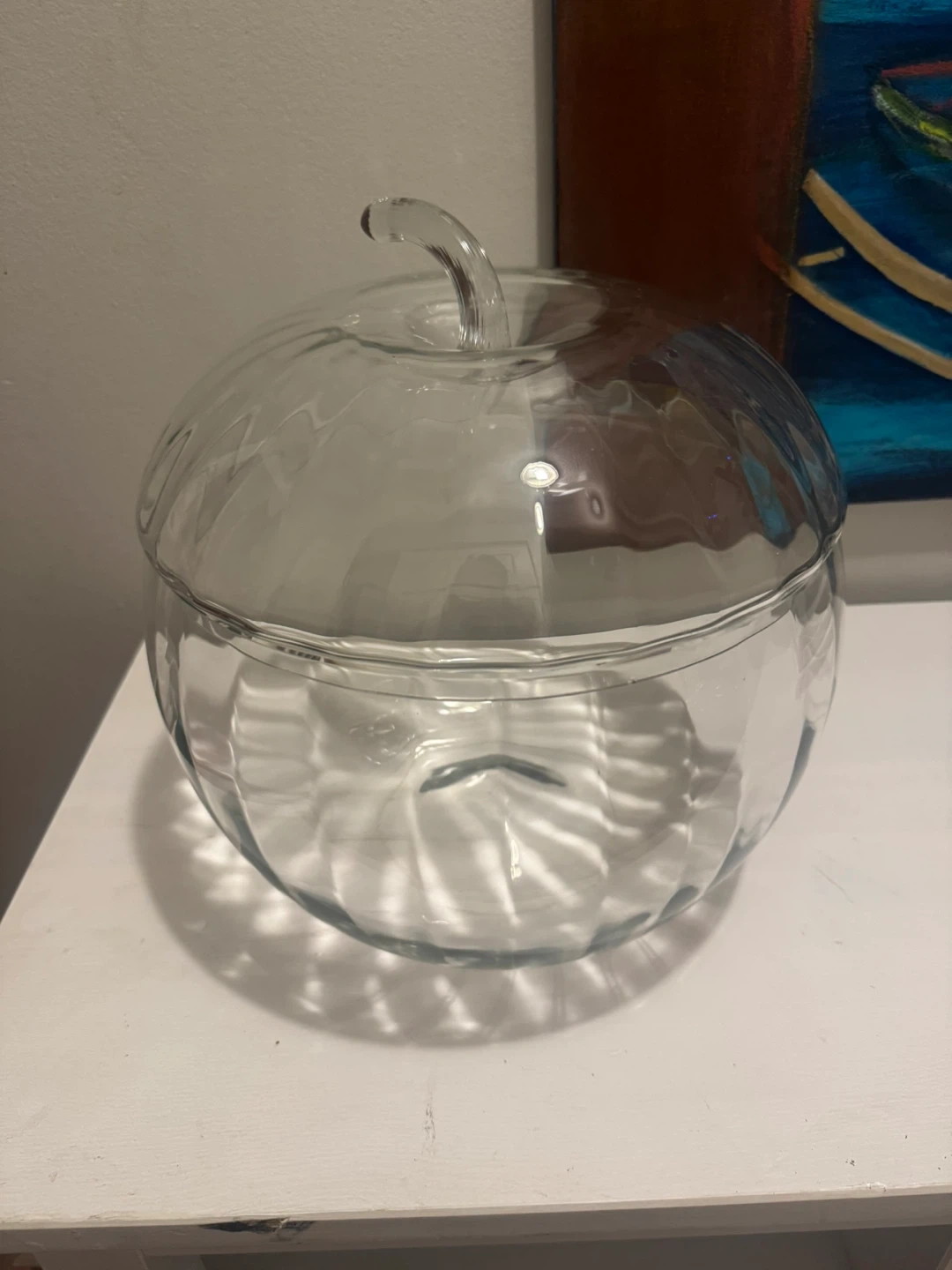 Selling a lovely glass pumpkin bowl with a lid! It's perfect for adding a touch of charm to your home decor or for serving punch and lemonade. The bowl is in great condition and ready to find a new home