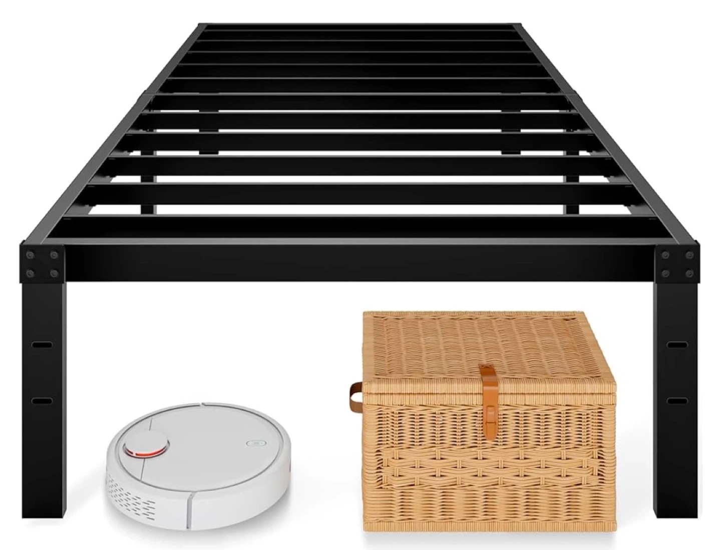 Selling a sturdy Twin XL metal bed frame in black! It's designed for stability and to minimize noise, so you can sleep well. It measures 80 inches in length and 39 inches in width, with a height of 12 inches. It's also designed to provide powerful storage space underneath