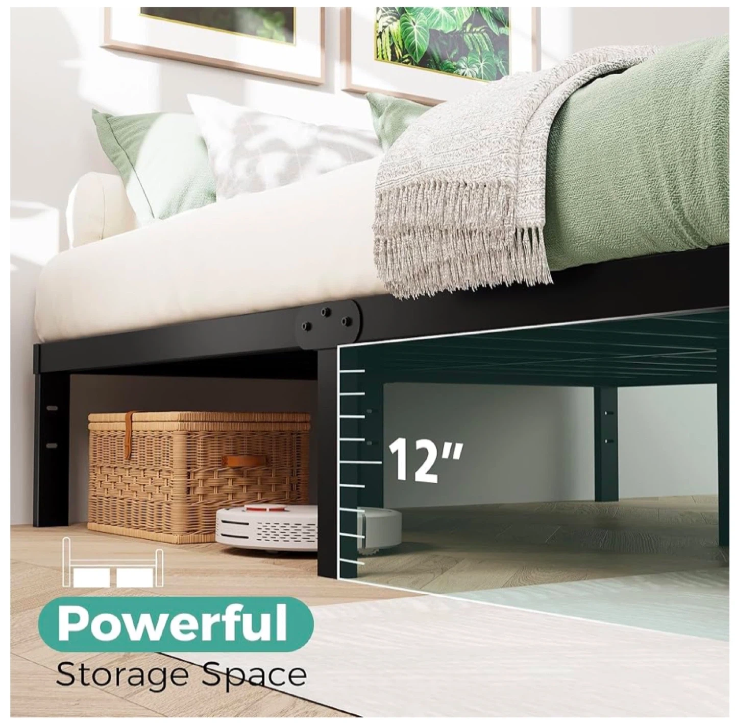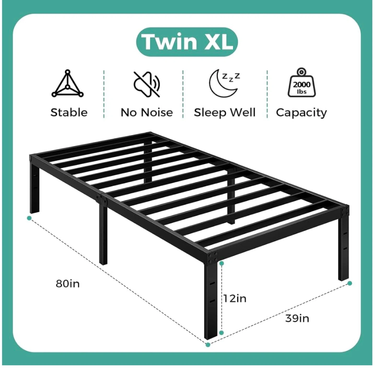 Selling a sturdy Twin XL metal bed frame in black! It's designed for stability and to minimize noise, so you can sleep well. It measures 80 inches in length and 39 inches in width, with a height of 12 inches. It's also designed to provide powerful storage space underneath