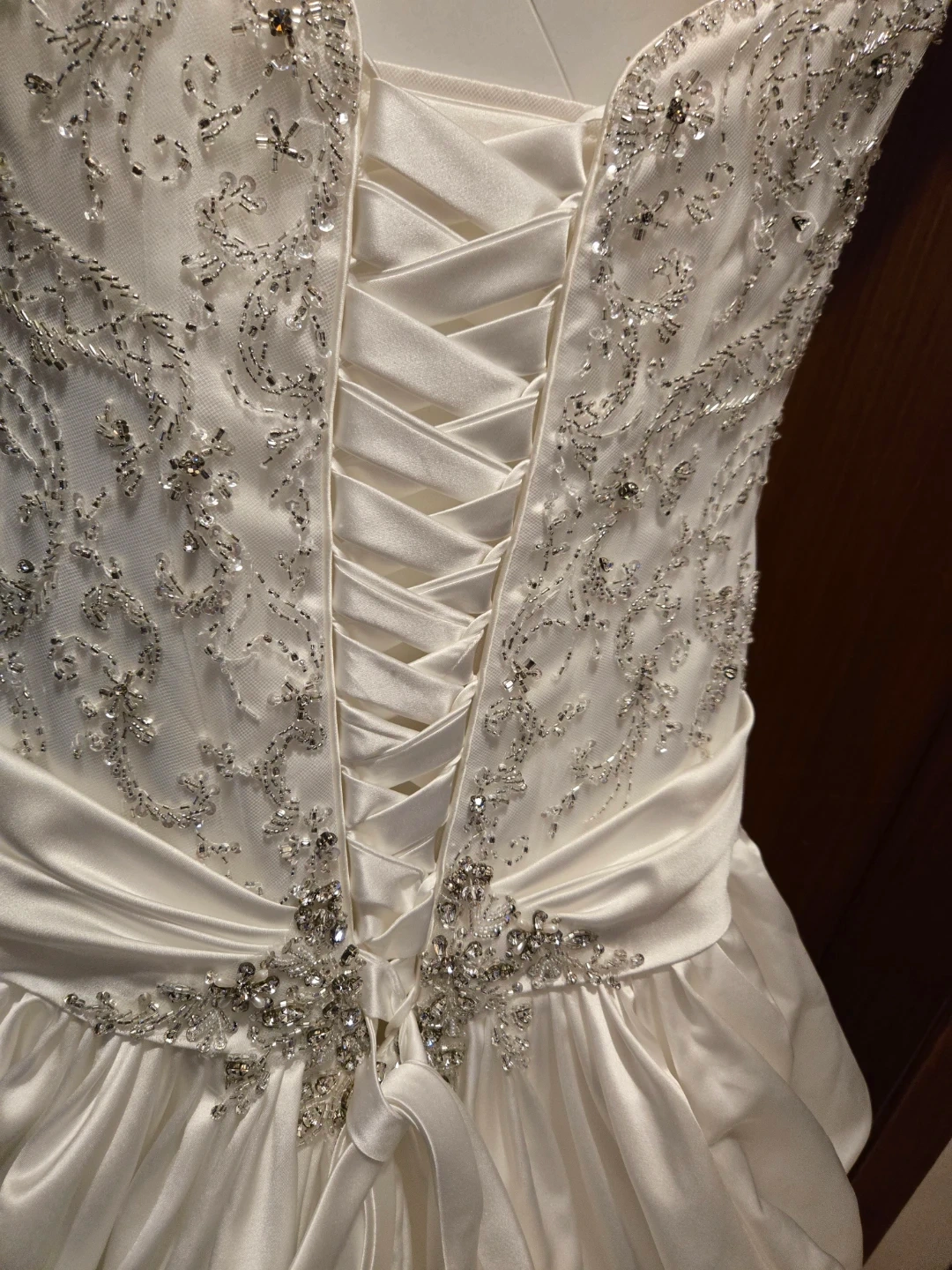 Selling a beautiful white wedding dress. It features intricate beading on the bodice and a layered skirt. Corset back.
