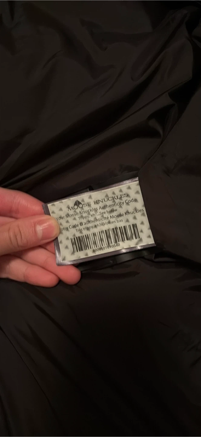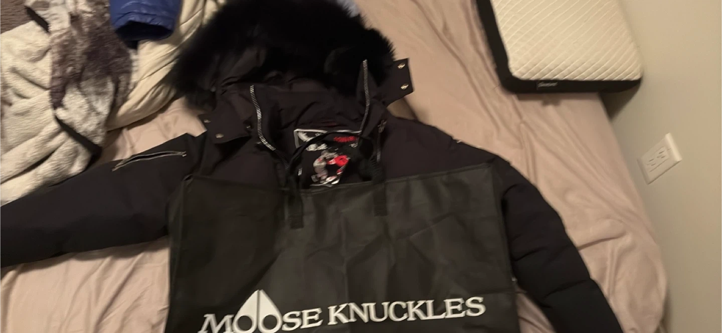 Here's a Moose Knuckles black down parka. It has a fur-trimmed hood and the brand's iconic metal logo on the sleeve. It's in great condition and ready for the cold weather!