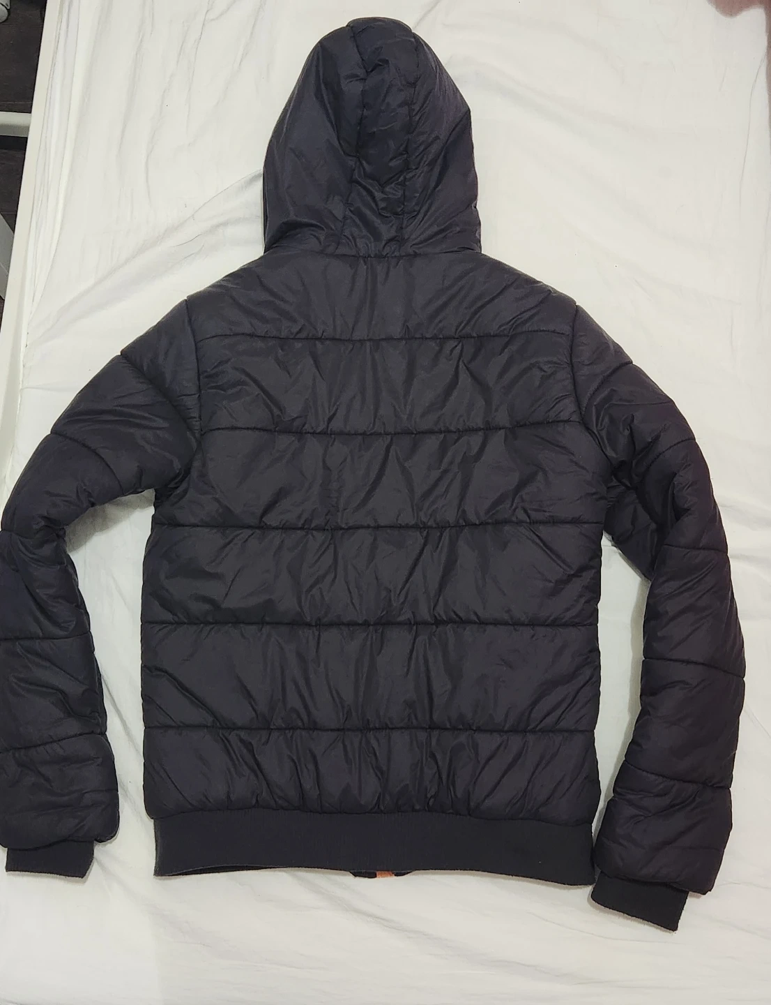 Cozy black puffer jacket from SK Sküad! It's a size small and features a hood and orange accents. Perfect for staying warm on those chilly days.