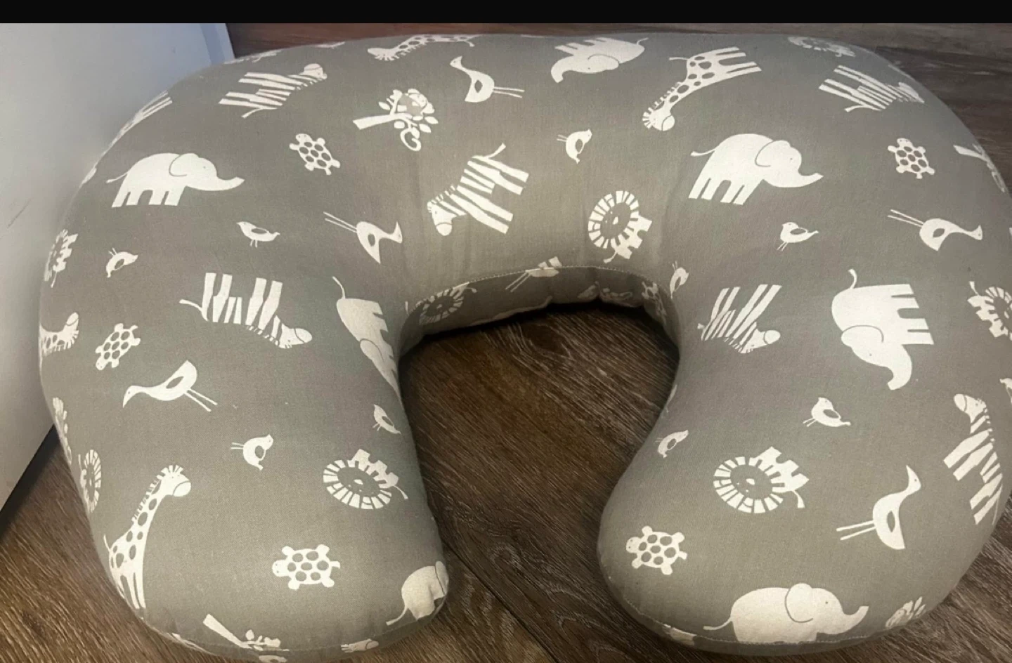 A gently used nursing pillow featuring a cute grey and white animal print! It's perfect for supporting your little one during feeding time. The pillow is in good condition and ready to help make nursing more comfortable for you and your baby