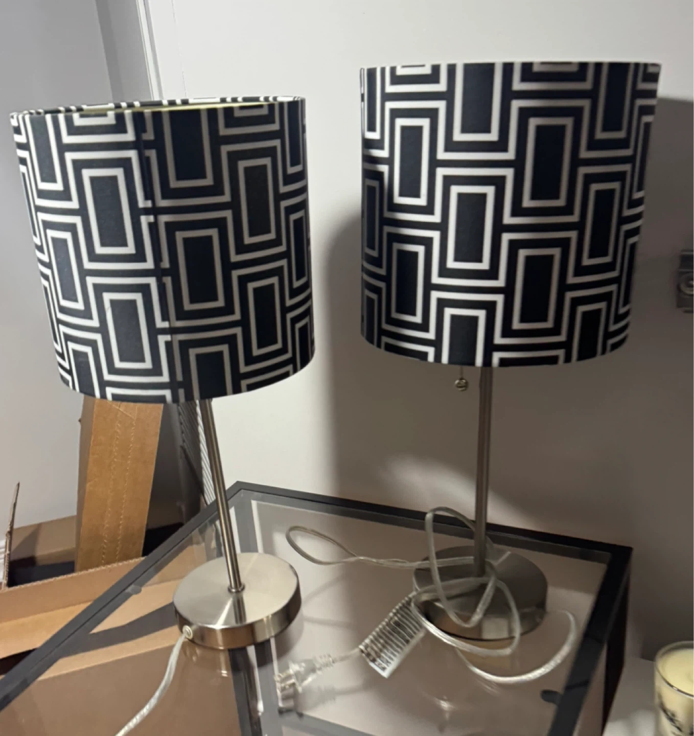 Selling a set of two table lamps with a striking black and white geometric pattern on the shades. They have a sleek, modern look with silver-tone bases that would fit well in any room. They're in great shape and ready to brighten up your space