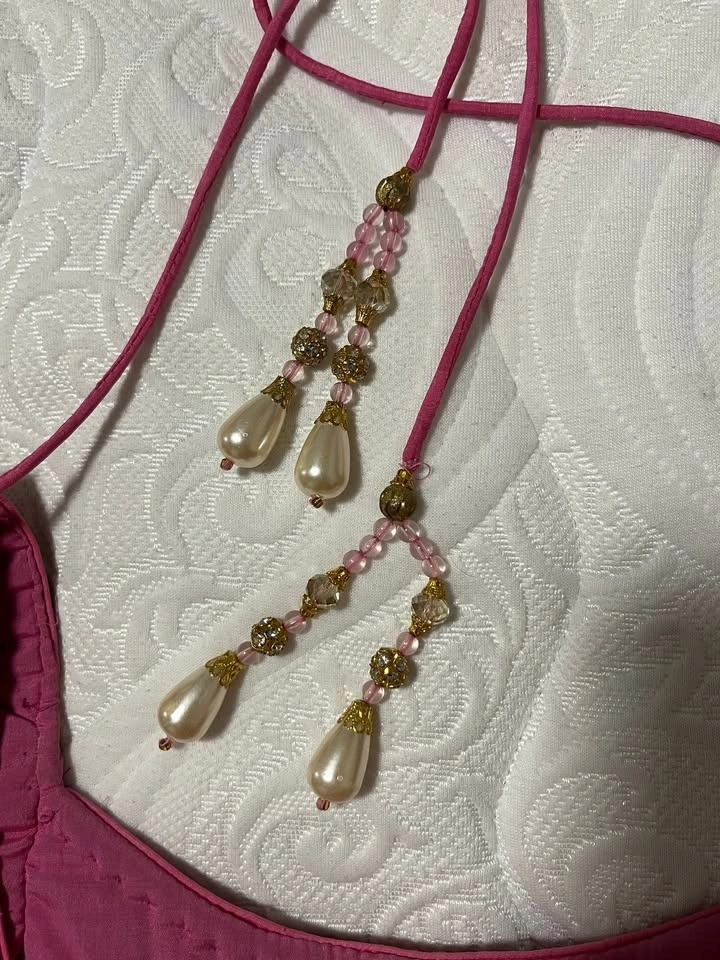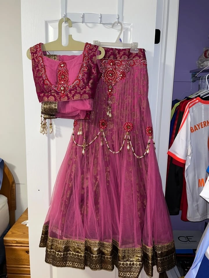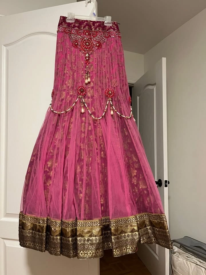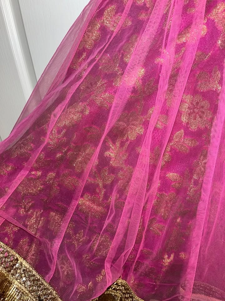 Beautiful hot pink lehenga with red and pearl accents worn only once at a wedding.