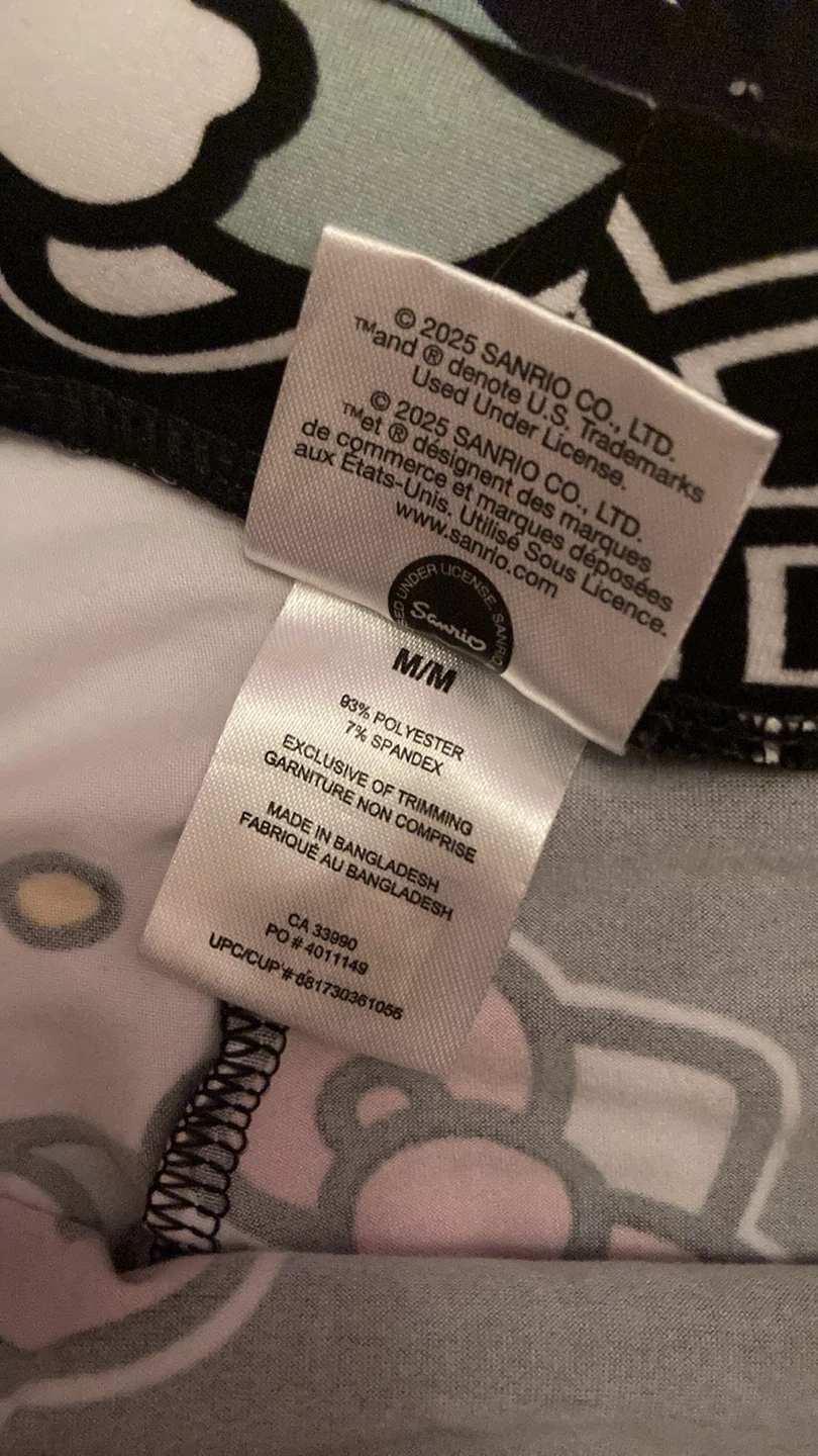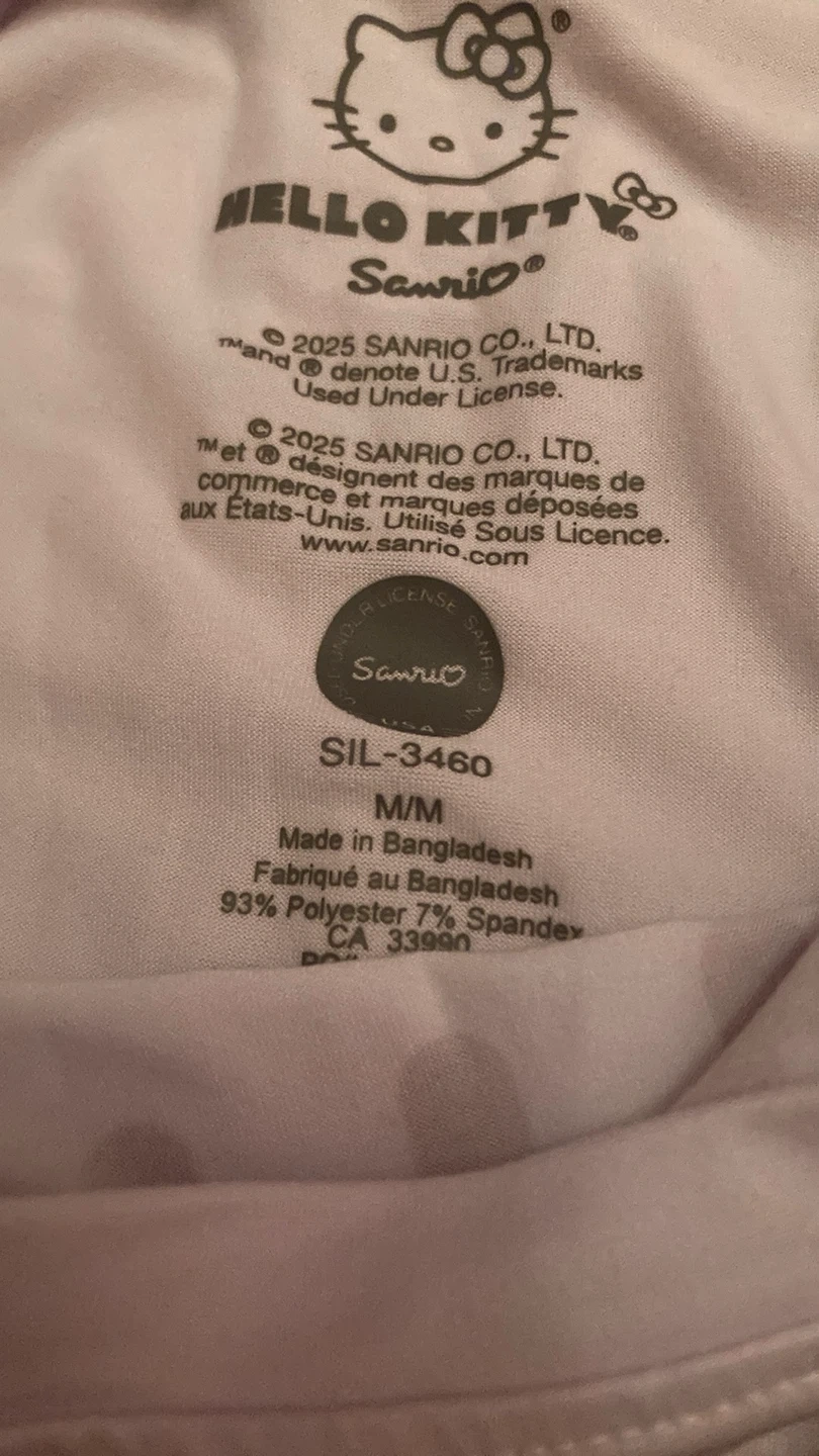 Super cute Hello Kitty pajama set in size M/M! The top is white with a large Hello Kitty graphic, and the bottoms are black with a Hello Kitty print. Both are made of a soft and comfy blend of polyester and spandex. Perfect for a cozy night in! And honestly it has a nice stretch for it too