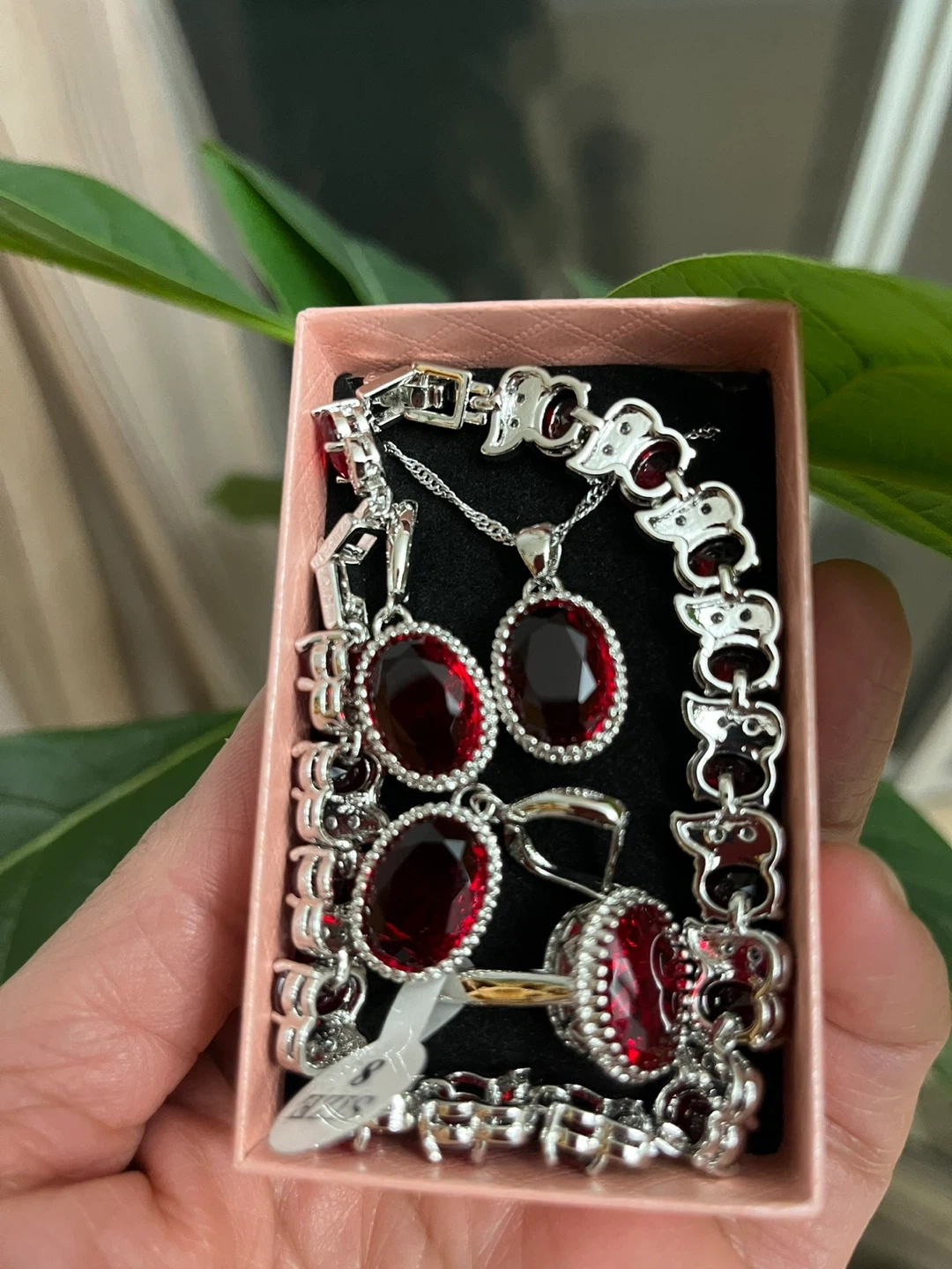 Selling a beautiful jewellery set featuring red gemstones. It includes a necklace, earrings, and a bracelet. Comes in a box, perfect as a gift!