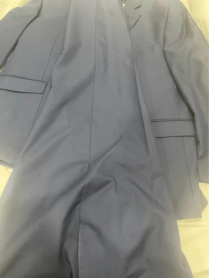 I have a navy blue suit that is Marc Jacobs brand from Macy’s. It is not brand new, but still in very good condition, it’s been just hanging in my closet for a while now, so would probably need dry cleaned. Let me know if you have any questions.