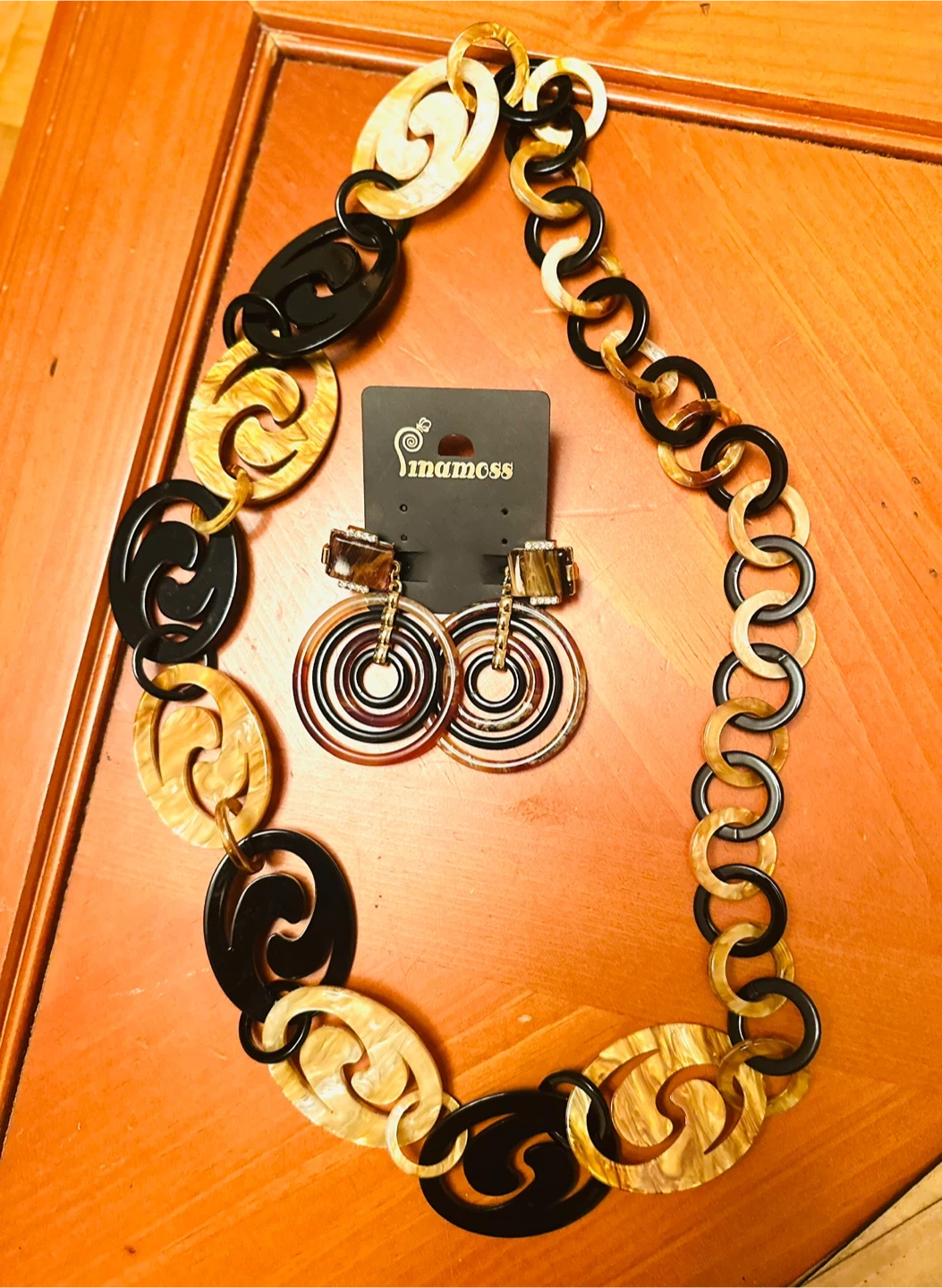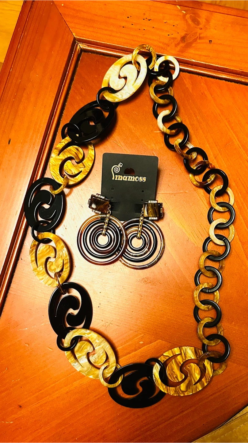 Here's a stylish necklace and earrings set from Linamoss! The necklace features a unique chain design with black and amber-colored links. The earrings have a cool, circular design with brown and black tones. Perfect for adding a touch of flair to any outfit