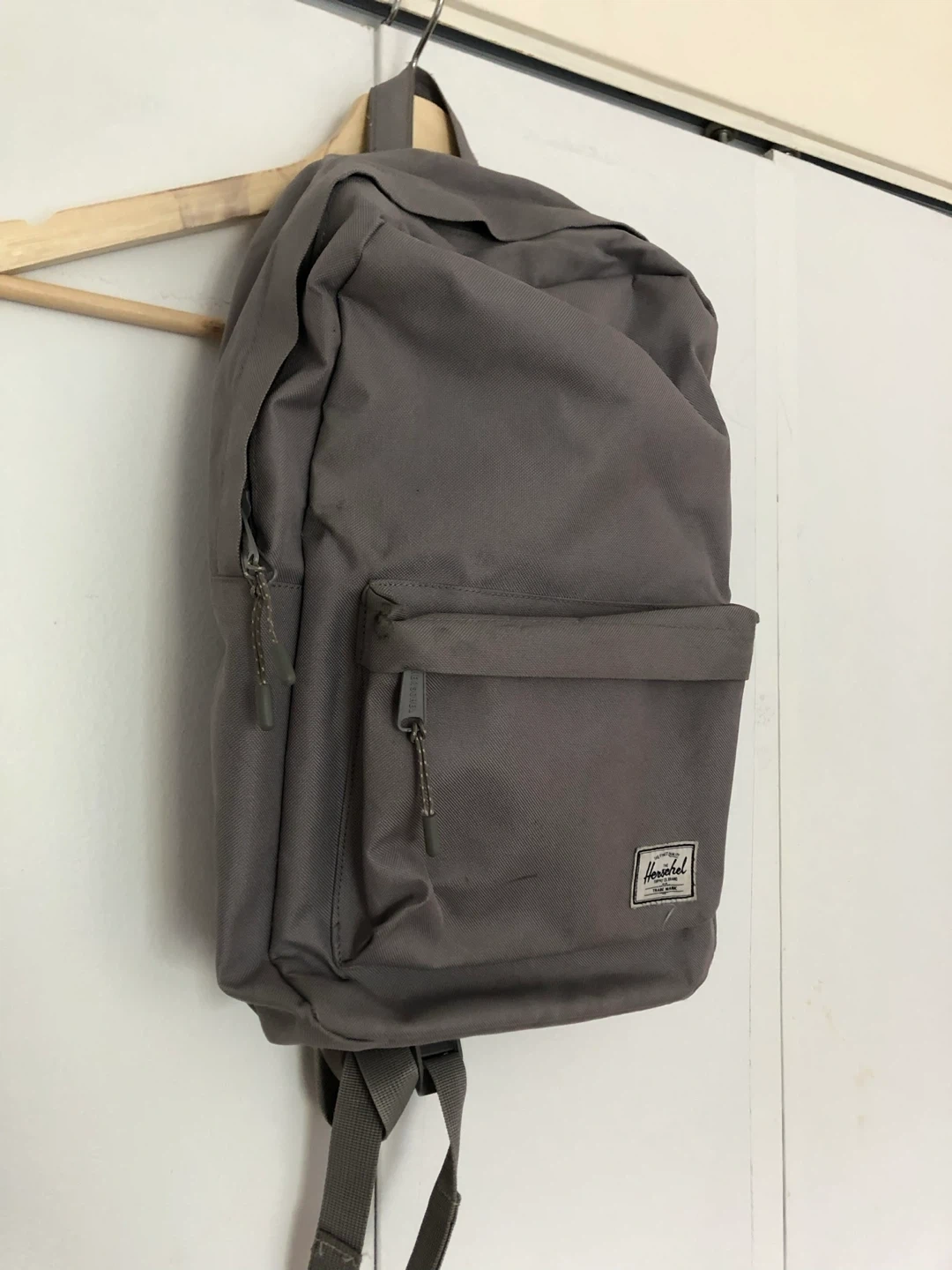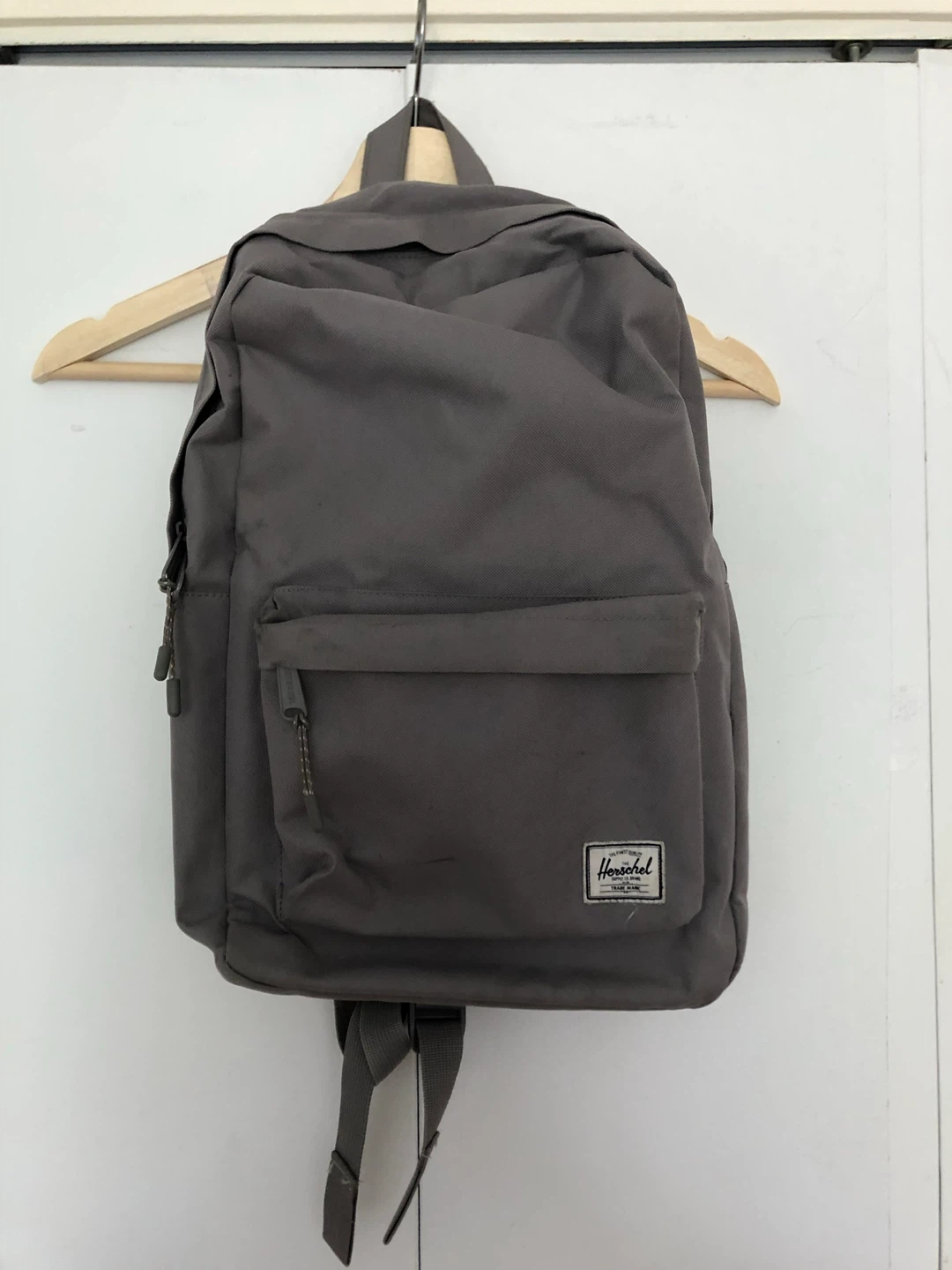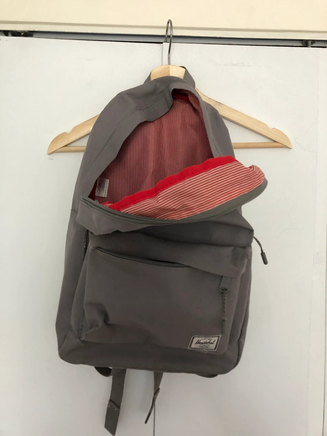 A simple gray Herschel backpack! It's in great condition and ready for a new owner. The inside has a red and white striped pattern.
