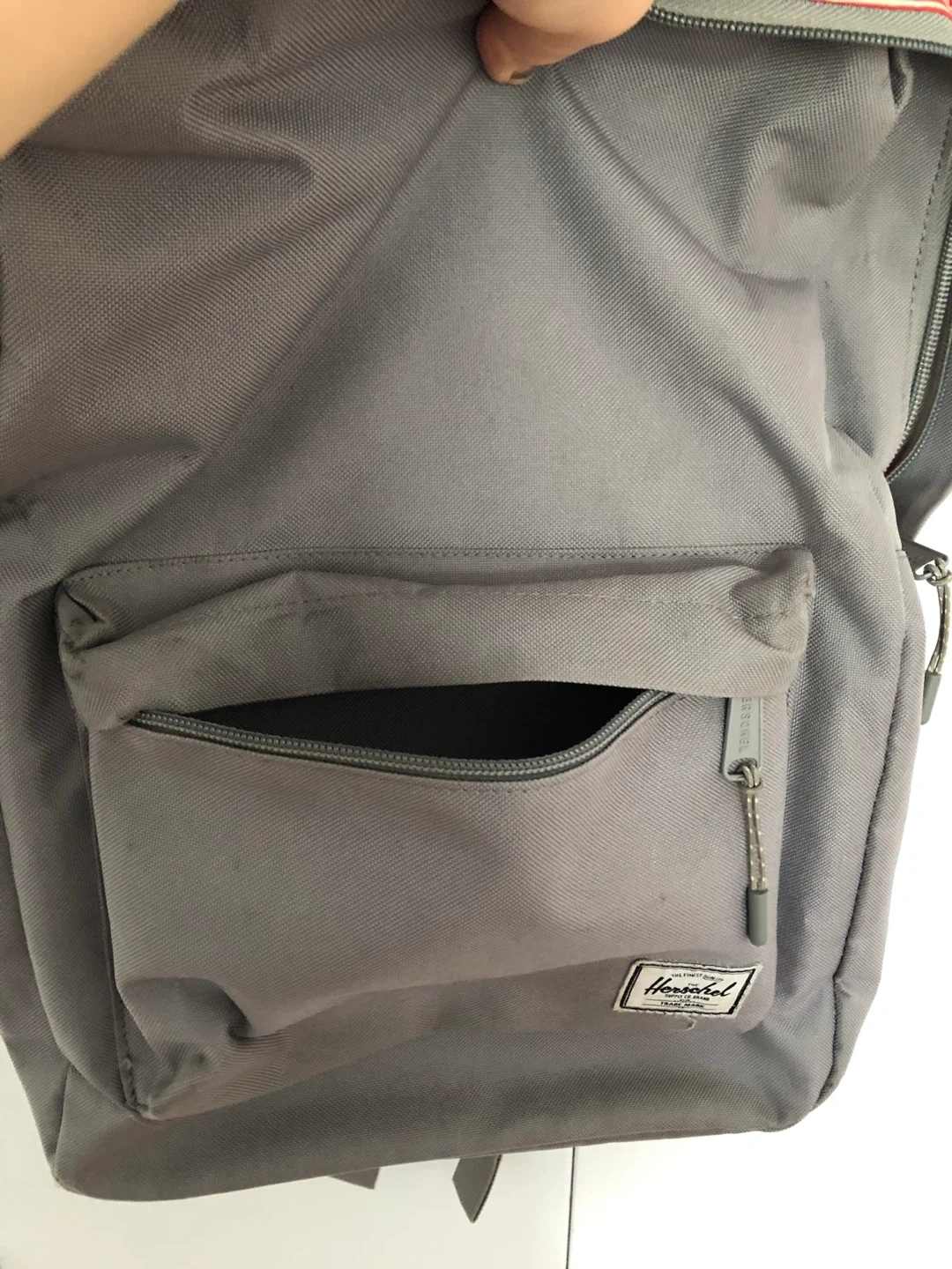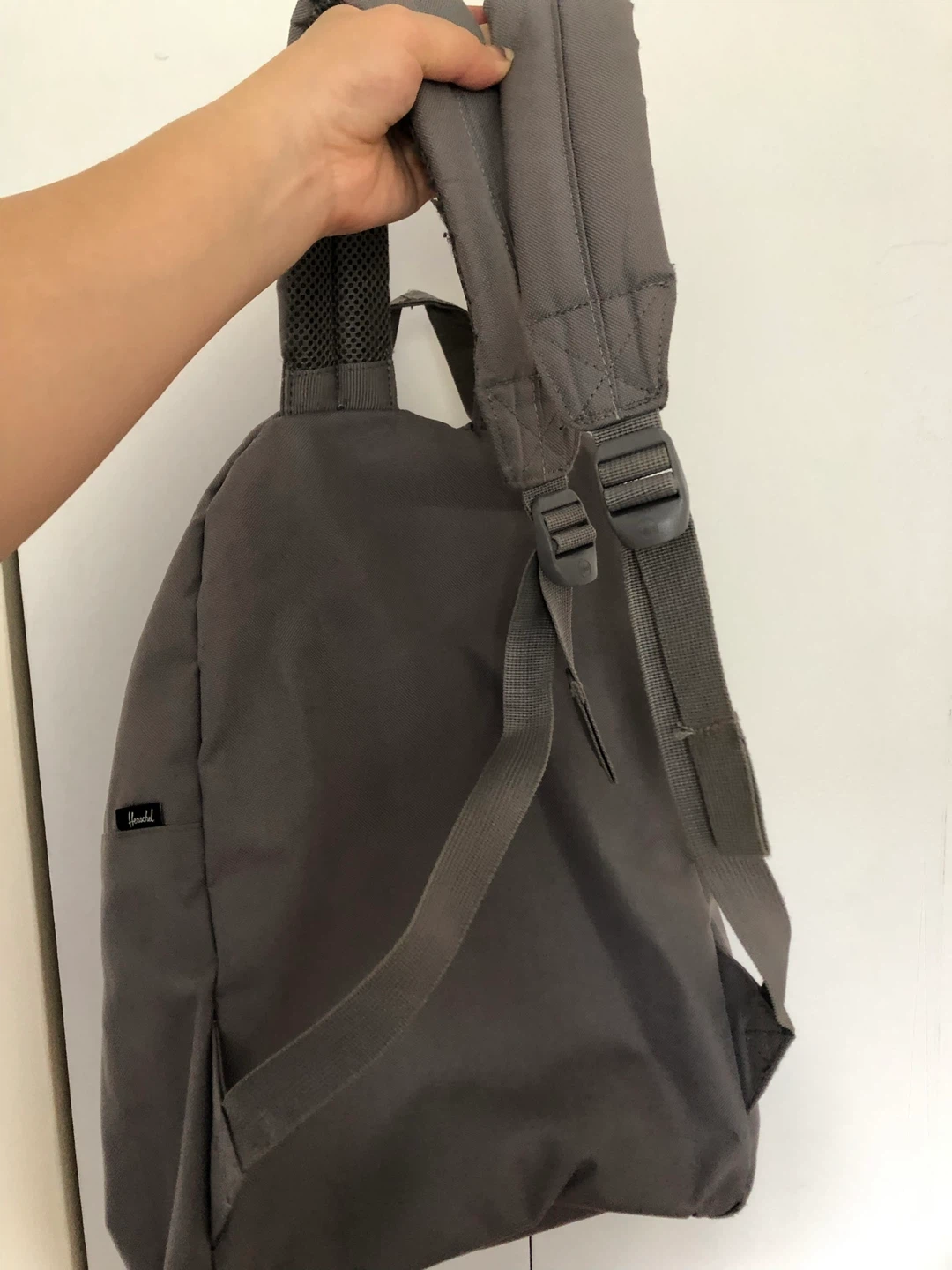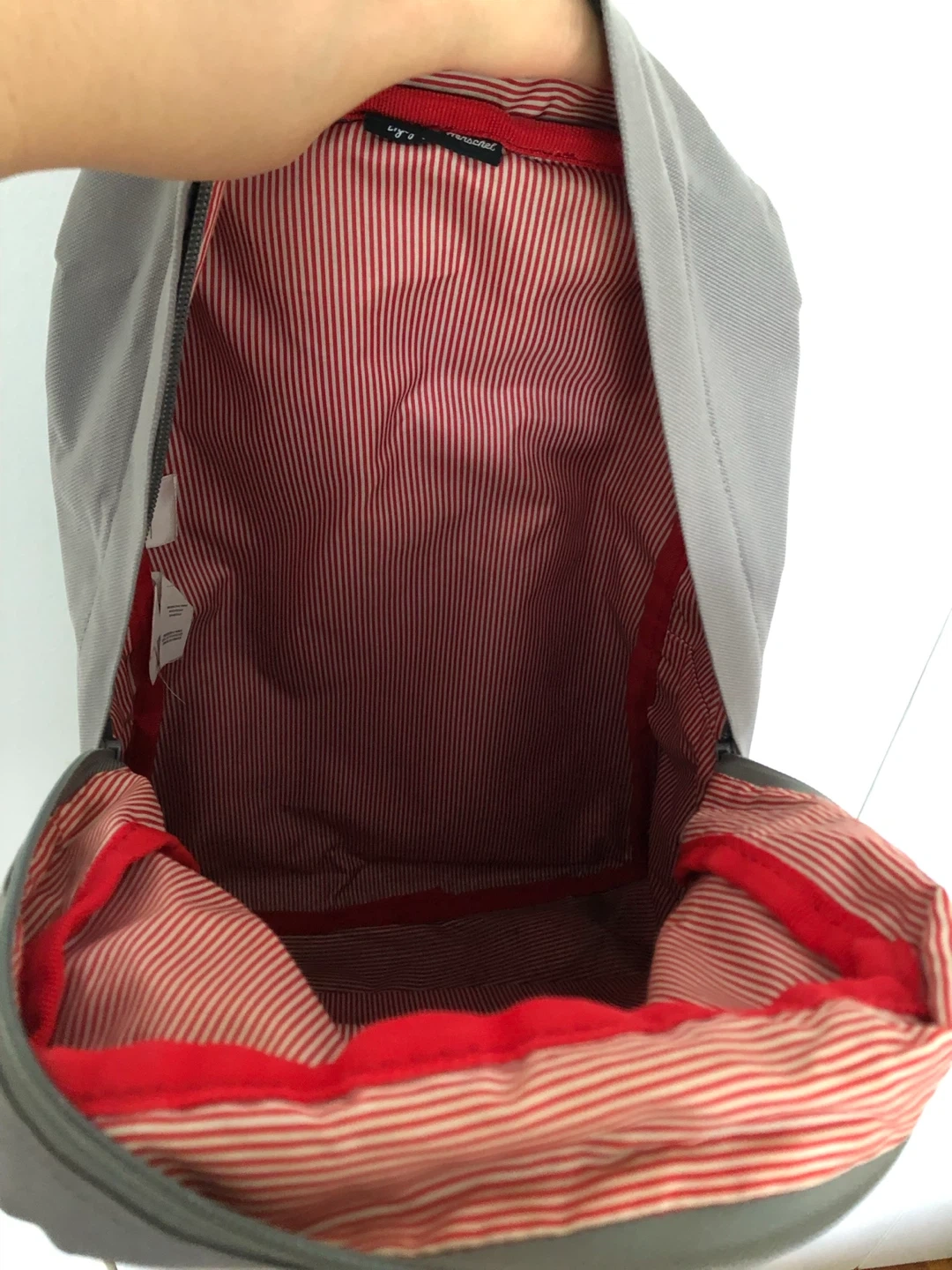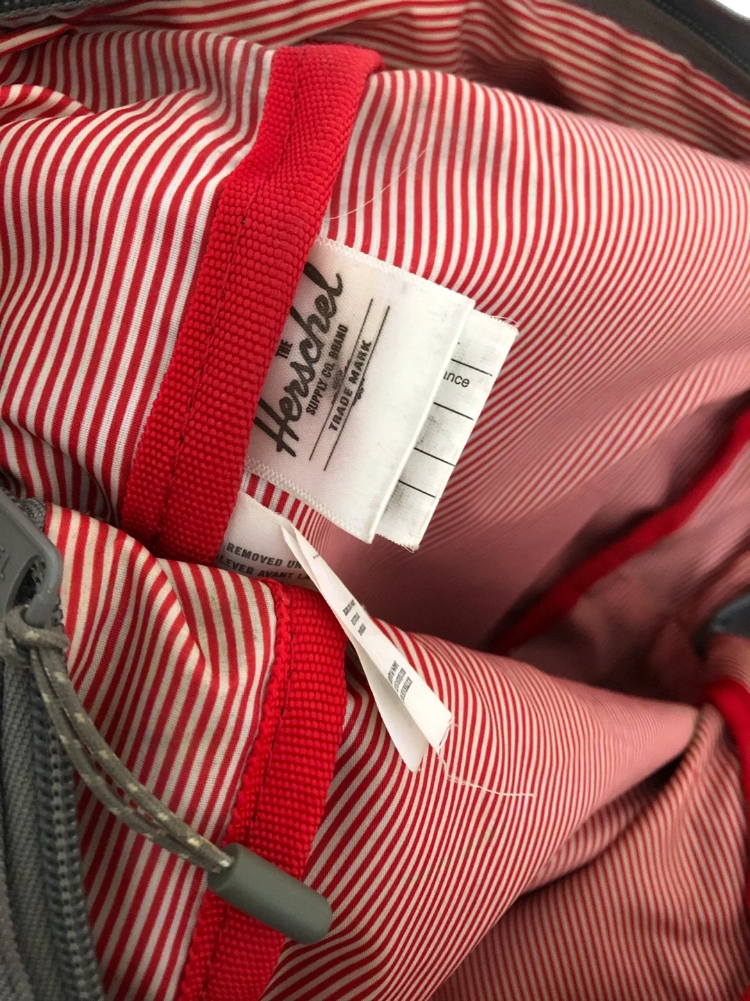 A simple gray Herschel backpack! It's in great condition and ready for a new owner. The inside has a red and white striped pattern.