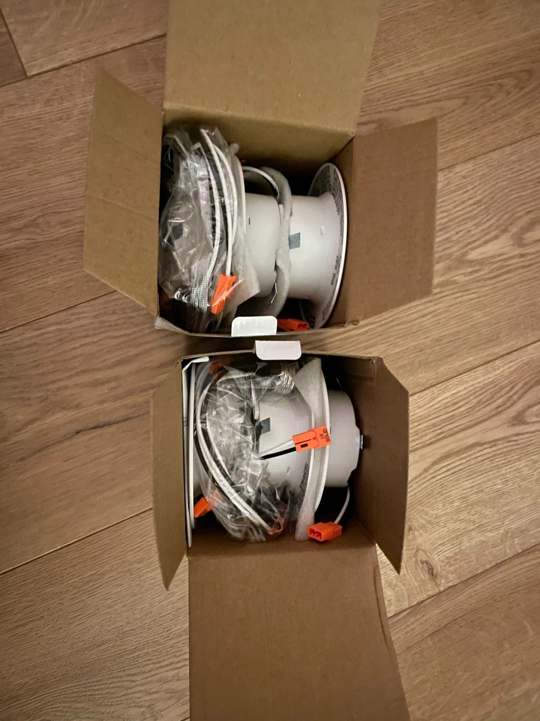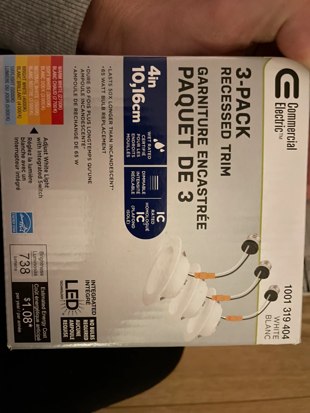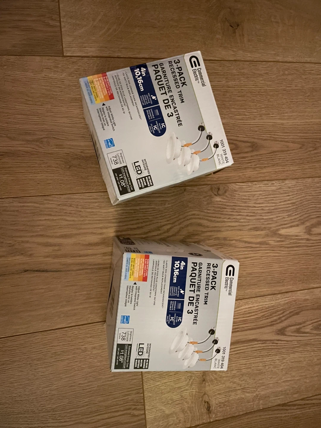 Selling a two 3-packs of Commercial Electric 4-inch recessed trim lights in white. They are brand new in box and ready to install! These are LED and require no bulbs. Each light is 65 watt bulb replacement.