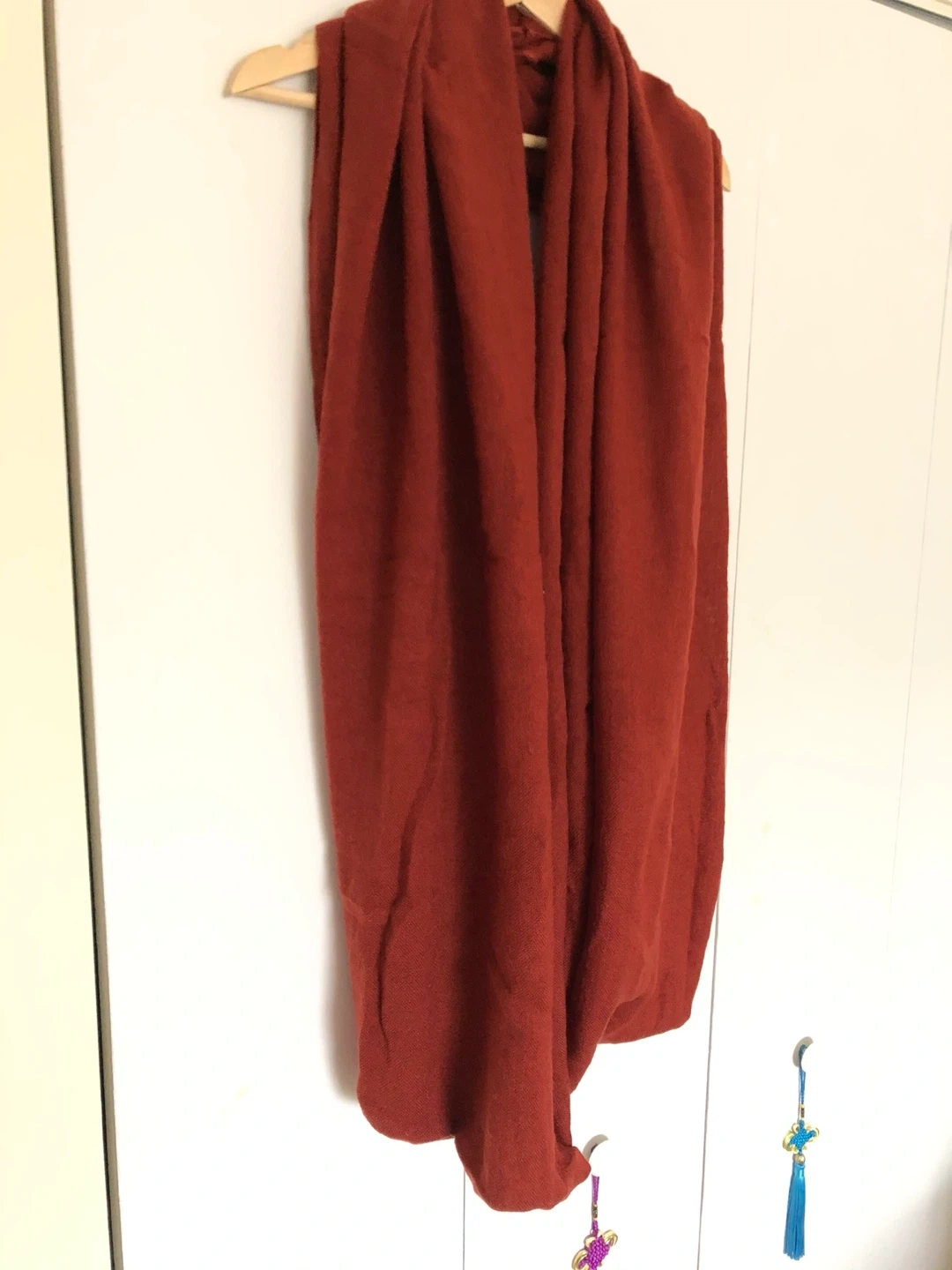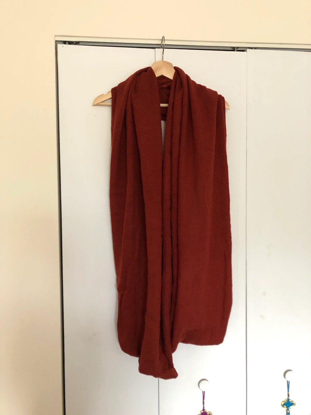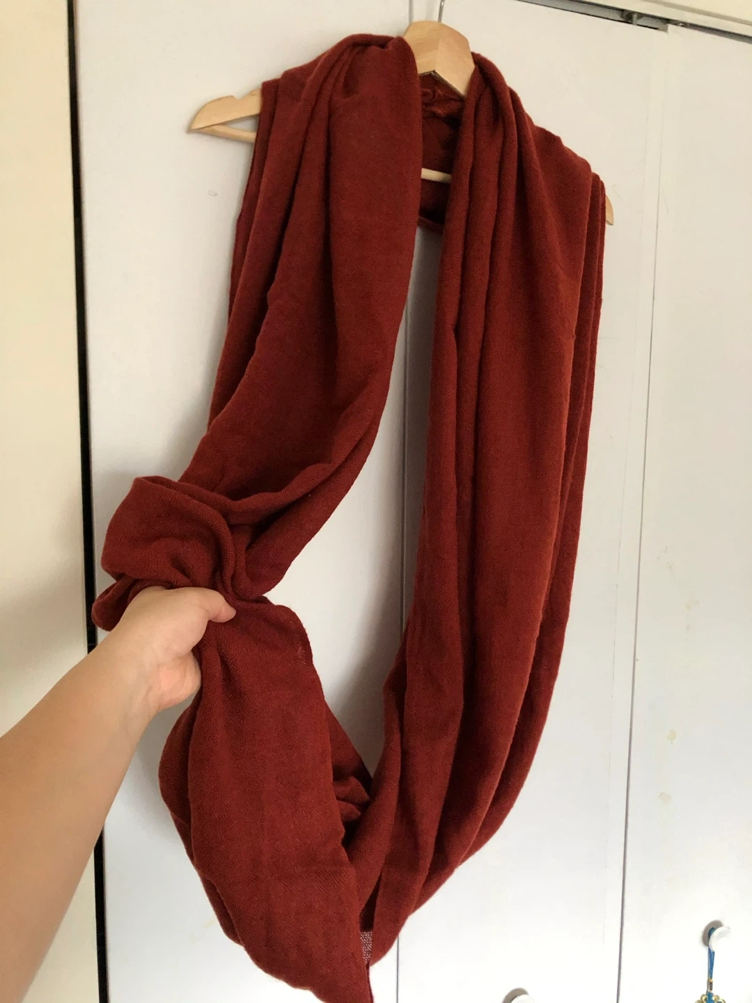 Cozy red infinity scarf! It's super soft and warm, perfect for chilly days. The color is a beautiful, rich red that would complement any outfit. It's in great condition and ready to keep you snug!