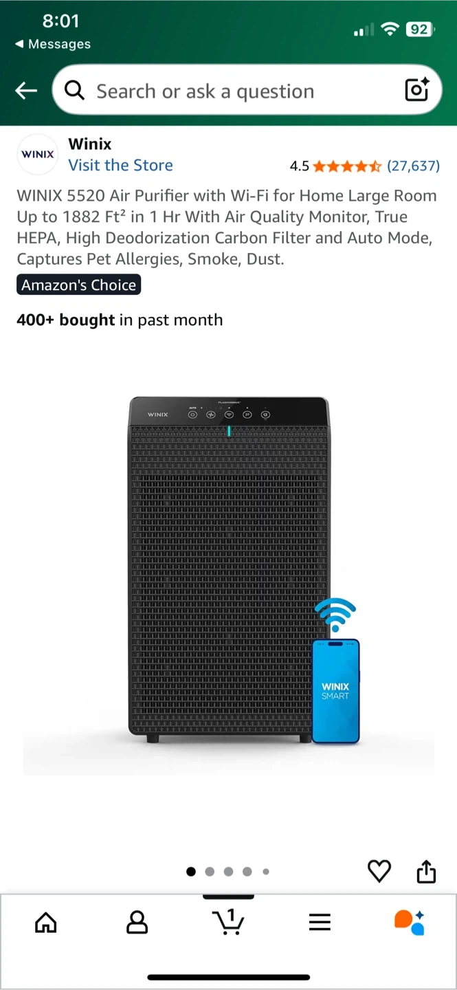 Selling a Winix 5520 Air Purifier in black! This air purifier is great for large rooms up to 1882 square feet and has a Wi-Fi for Home Large Room Air Quality Monitor. It features True HEPA, High Deodorization Carbon Filter, and Auto Mode, and captures Pet Allergies, Smoke, and Dust. It's also compatible with Amazon Alexa. The original price was $249.99. It includes the filter set and the box!