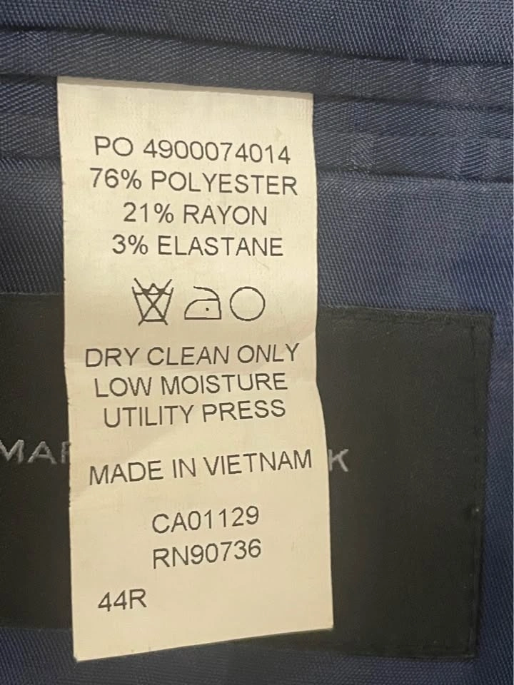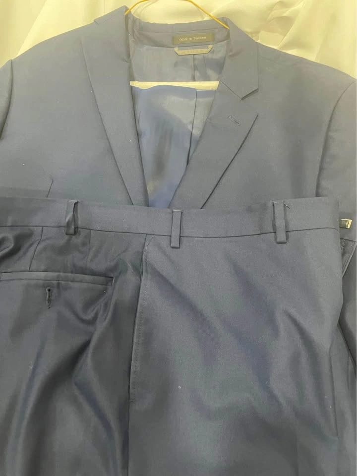 I have a navy blue suit that is Marc Jacobs brand from Macy’s. It is not brand new, but still in very good condition, it’s been just hanging in my closet for a while now, so would probably need dry cleaned. Let me know if you have any questions.