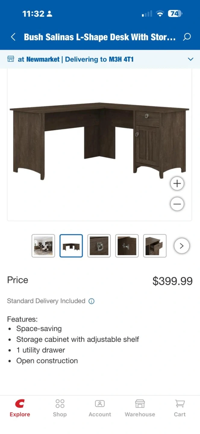 Selling a Bush Salinas L-Shape desk with storage. It's a great space-saving desk with a storage cabinet and adjustable shelf. It also has a utility drawer and open construction. Retails for $399.99. There is some wear on the edge of the desk as shown in the picture.