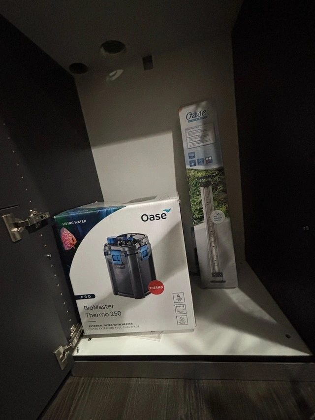 Brand new, rare aquarium. Never used. Absolutely perfect condition. Was told only 12 prototypes were made of this unit. Comes with spring open lid with slider to feed fish and spring open cabinet door, remote control lighting, oase filter. All interior aquarium equipment is artfully designed to hide within the aquarium. Dark grey and brushed nickel trim. Tank Dimensions are 27.5”/70cm long 19.5”/50cm wide and high Total height with cabinet is 61.5”/156cm. This is a gorgeous piece. Original cost of aquarium was $2400 WITHOUT FILTER.