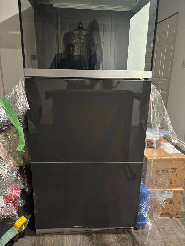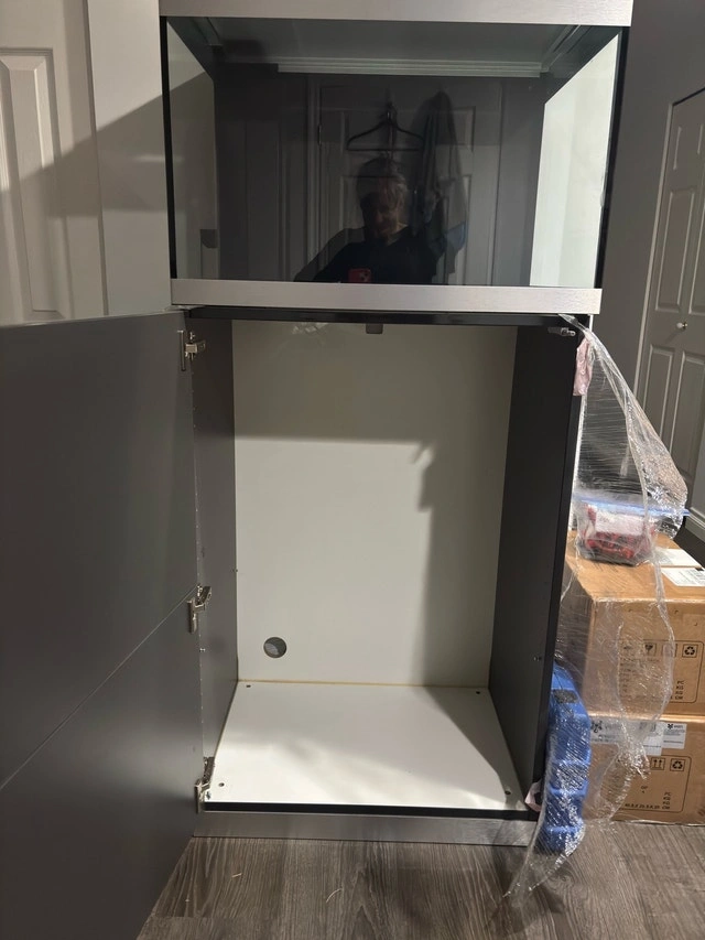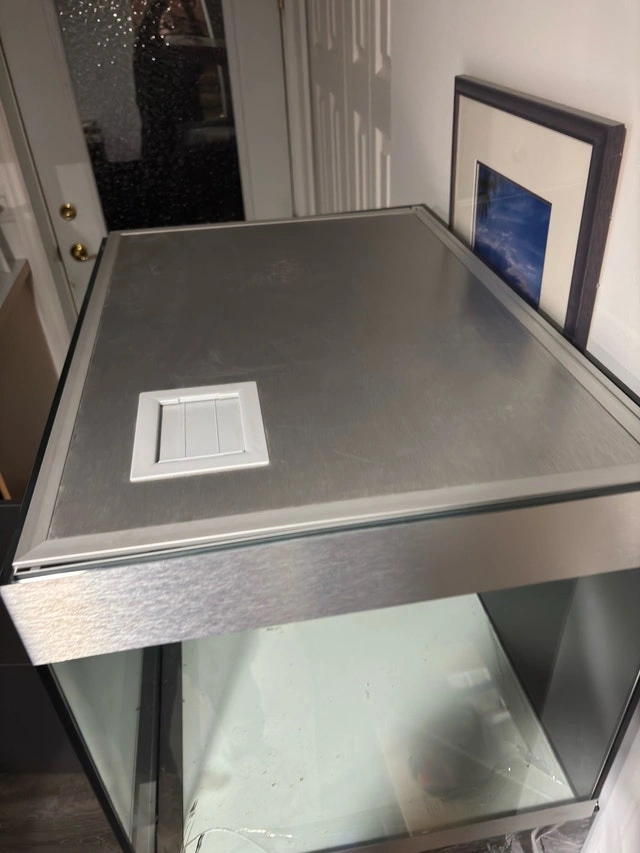 Brand new, rare aquarium. Never used. Absolutely perfect condition. Was told only 12 prototypes were made of this unit. Comes with spring open lid with slider to feed fish and spring open cabinet door, remote control lighting, oase filter. All interior aquarium equipment is artfully designed to hide within the aquarium. Dark grey and brushed nickel trim. Tank Dimensions are 27.5”/70cm long 19.5”/50cm wide and high Total height with cabinet is 61.5”/156cm. This is a gorgeous piece. Original cost of aquarium was $2400 WITHOUT FILTER.