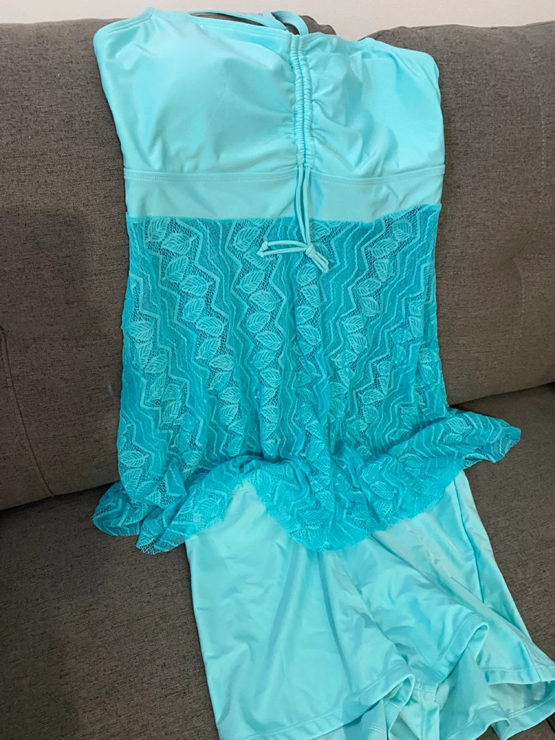 Selling a cute turquoise swimsuit tankini set. It features a tankini top with a lace leaf pattern and matching bottoms. Perfect for swimming or lounging by the pool! Size 2x
