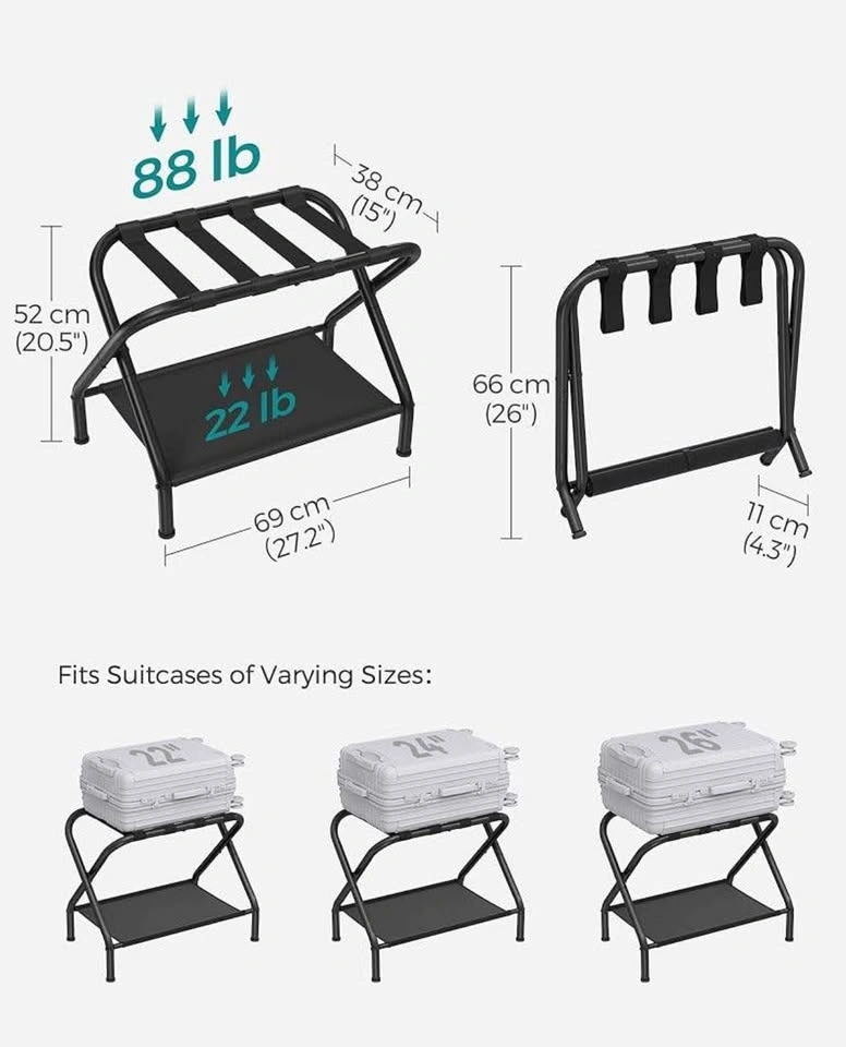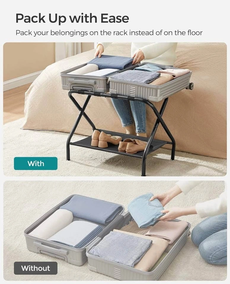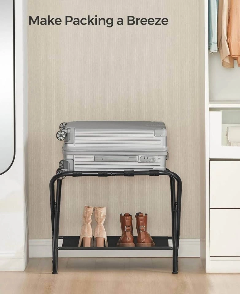 Perfect for guests, Airbnb, hotels, or everyday home use. These sturdy, foldable suitcase stands keep luggage off the floor and include a fabric storage shelf for shoes or bags.