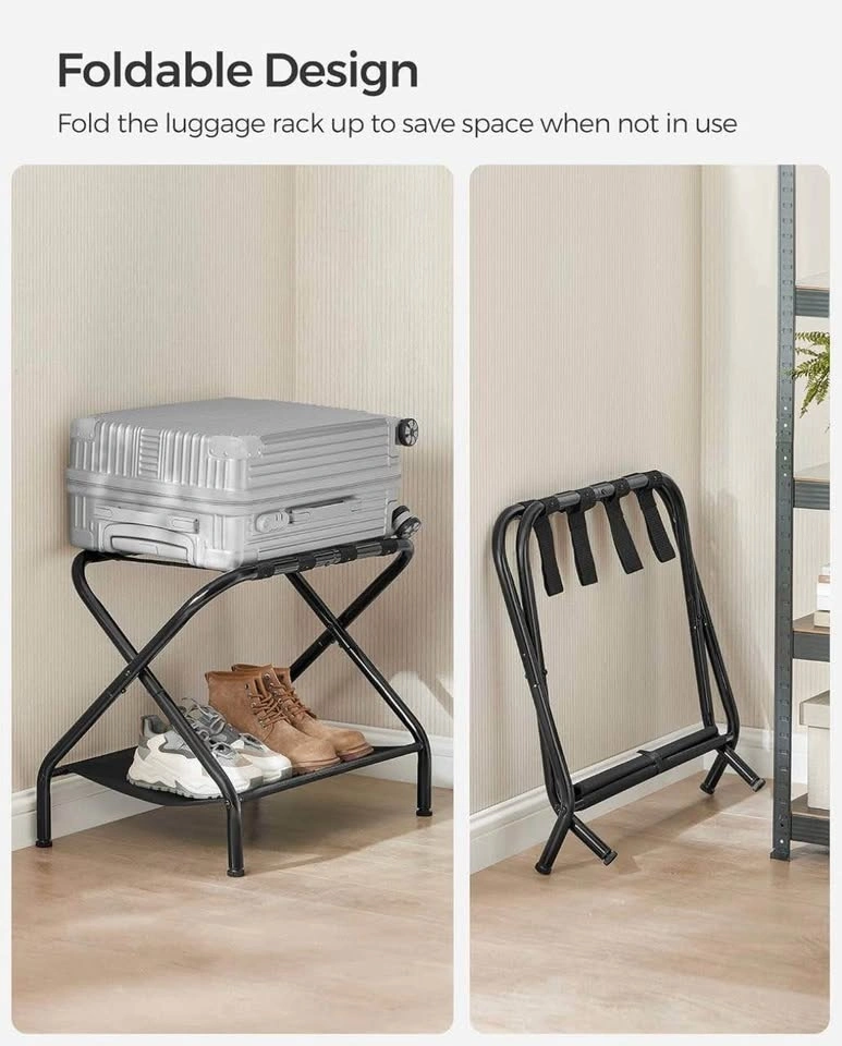 Perfect for guests, Airbnb, hotels, or everyday home use. These sturdy, foldable suitcase stands keep luggage off the floor and include a fabric storage shelf for shoes or bags.