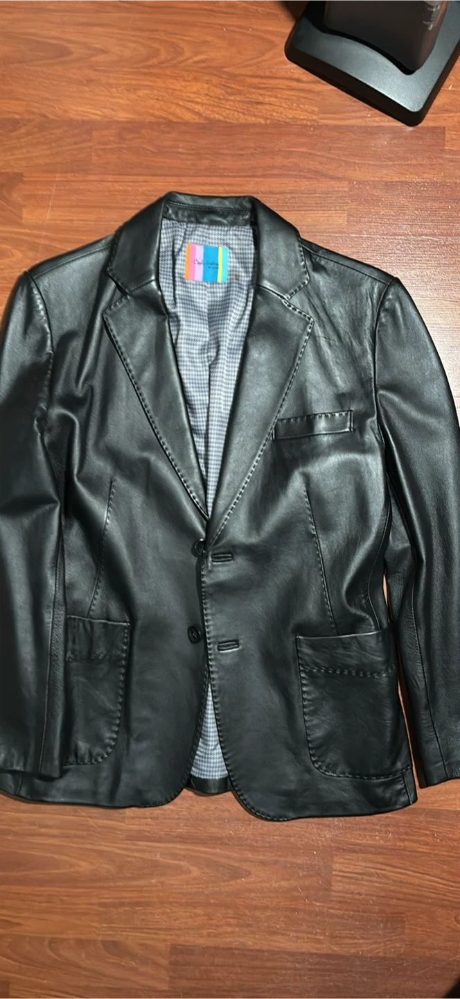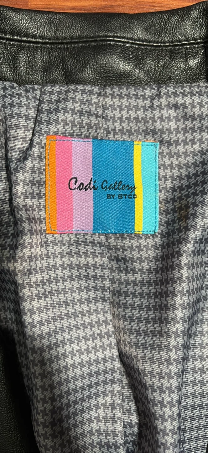 Selling a stylish black leather blazer from Codi Gallery. The interior has a unique grey pattern.
