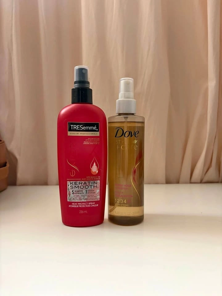 heat products: Tresemmé heat protection (60% left) and Dove extra hold spray both for $15