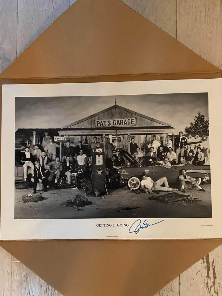 Pat Burns (former NHL coach), Doug Gilmour, Grant Fuhr and Wendel Clark. Signed by Pat Burns. The 1st ever print in the Toronto Maple Leafs Quintology Collection. Named "Getting it Going", quickly turned into Pat's Garage. A retrospective photograph of the Toronto Maple Leafs in a 50's scene. Print measures 20 x 28.5 inches. This poster is numbered 16,462 of 26721. It has an official Toronto Maple Leafs stamp. Comes with a Toronto Maple Leafs shipping container included. From the 1992 Collection. Photographed by Gary Wildman. Has some slight water marks at the bottom left.