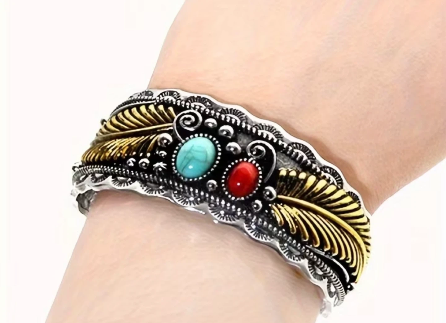 Selling a beautiful boho-style cuff bracelet! It features a silver-tone metal with gold-tone feather accents and turquoise and coral coloured stones. The bracelet is 6.2cm (2.44in) in diameter. A unique piece to add to your collection!