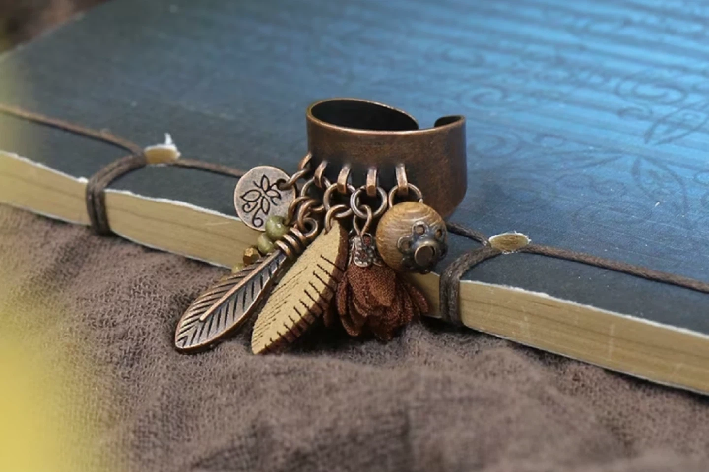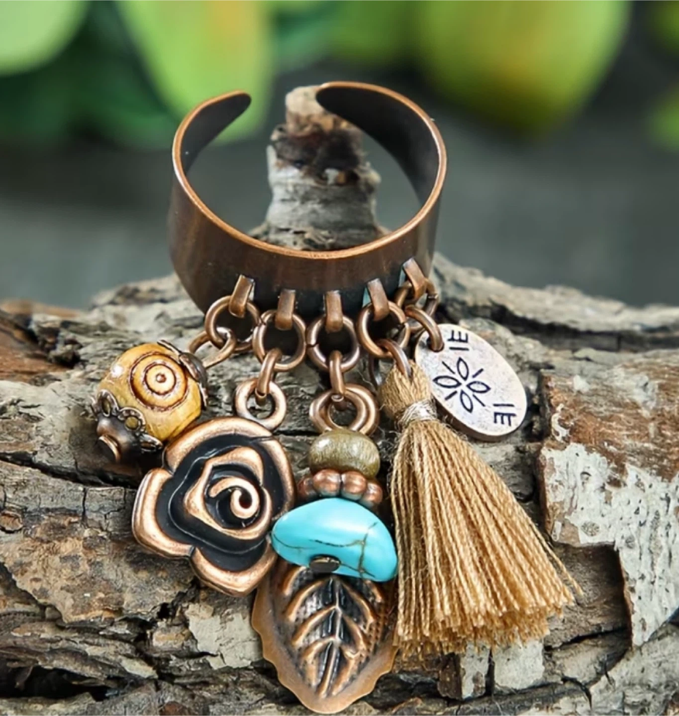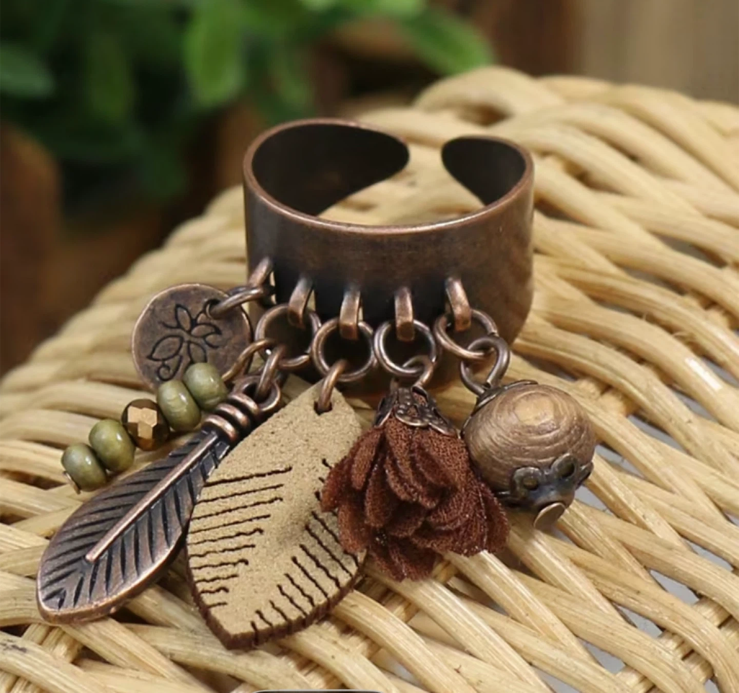 Check out this unique boho-style ring! It features an adjustable band in a copper tone, adorned with various charms including feathers, beads, and a tassel. A great statement piece to add some flair to any outfit