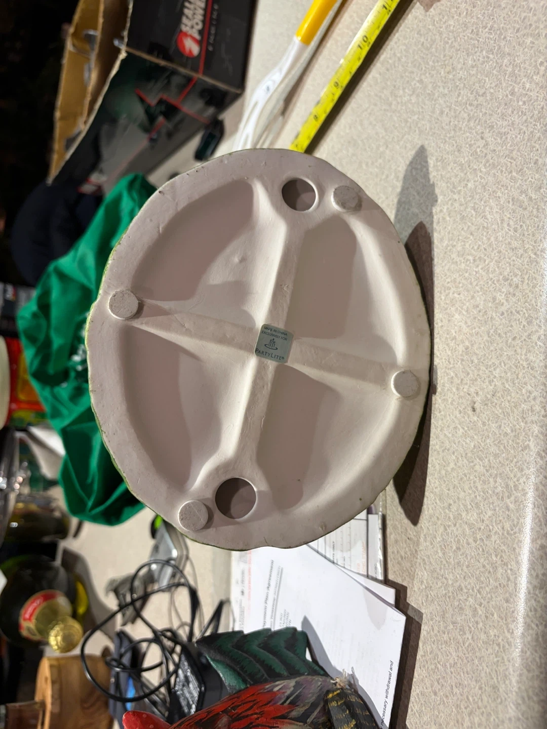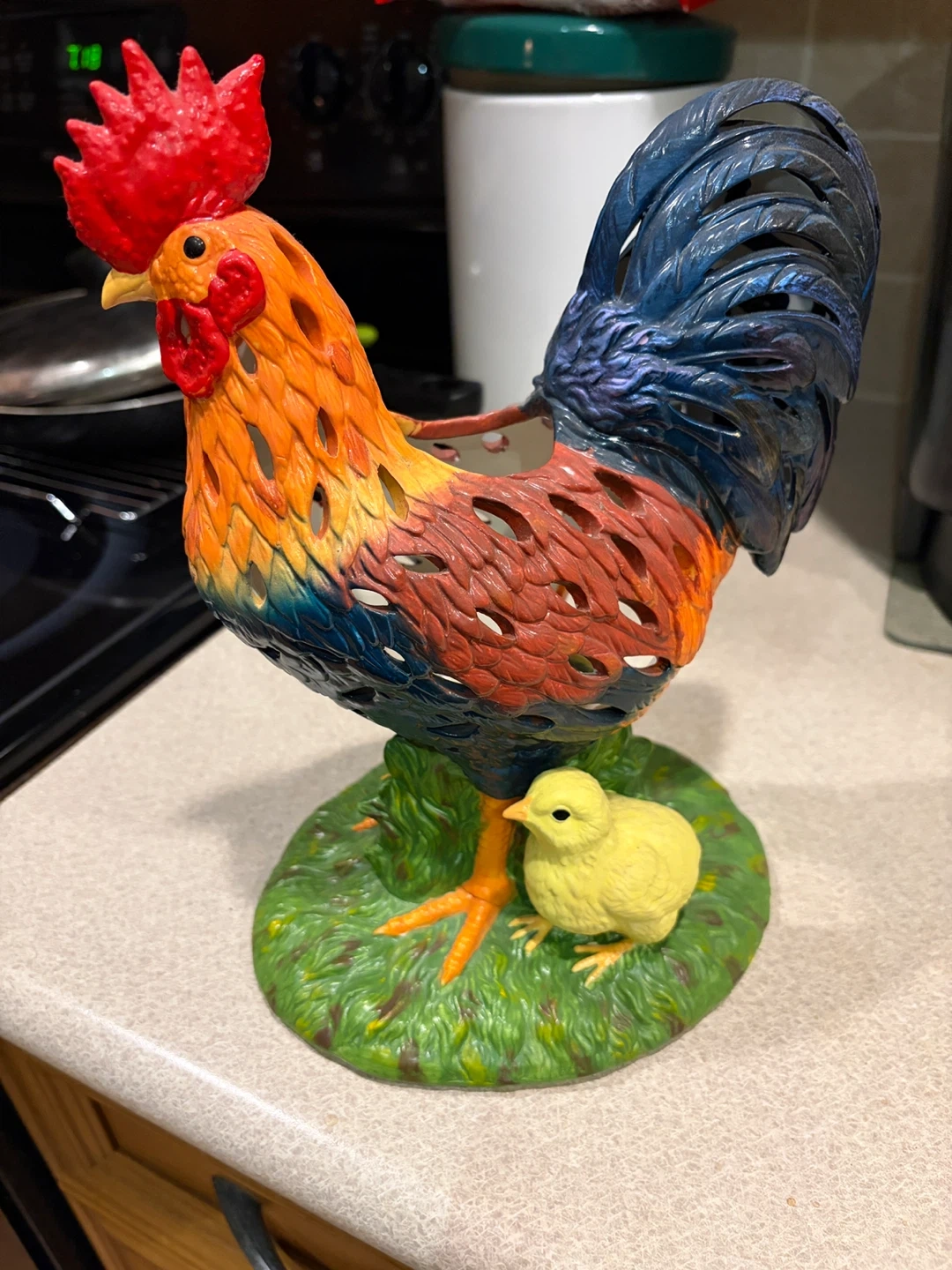 This is a Partylite rooster candle holder in good condition. It features a colourful rooster with 2 small chicks on a green base. The bottom has the Partylite sticker. Original box included.