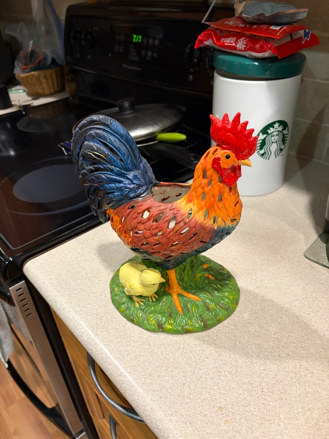 This is a Partylite rooster candle holder in good condition. It features a colourful rooster with 2 small chicks on a green base. The bottom has the Partylite sticker. Original box included.
