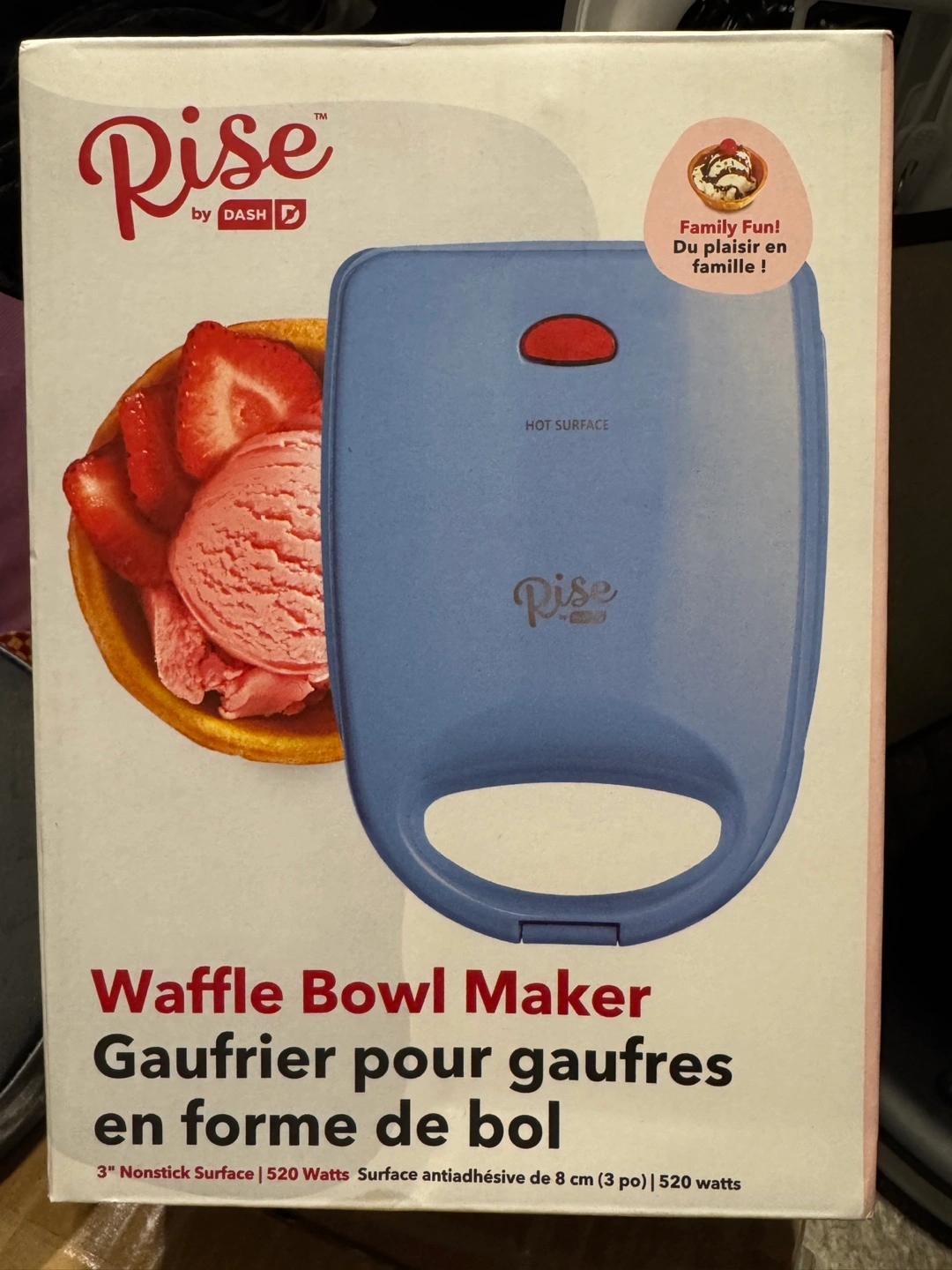 I'm selling a Rise by Dash waffle bowl maker! It has a 3" nonstick surface and uses 520 watts. Perfect for family fun!