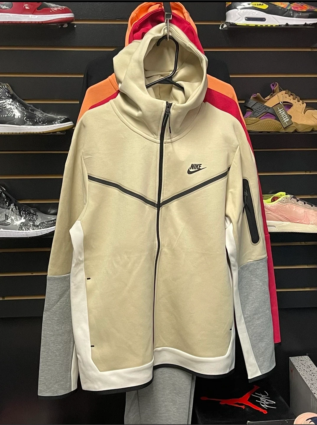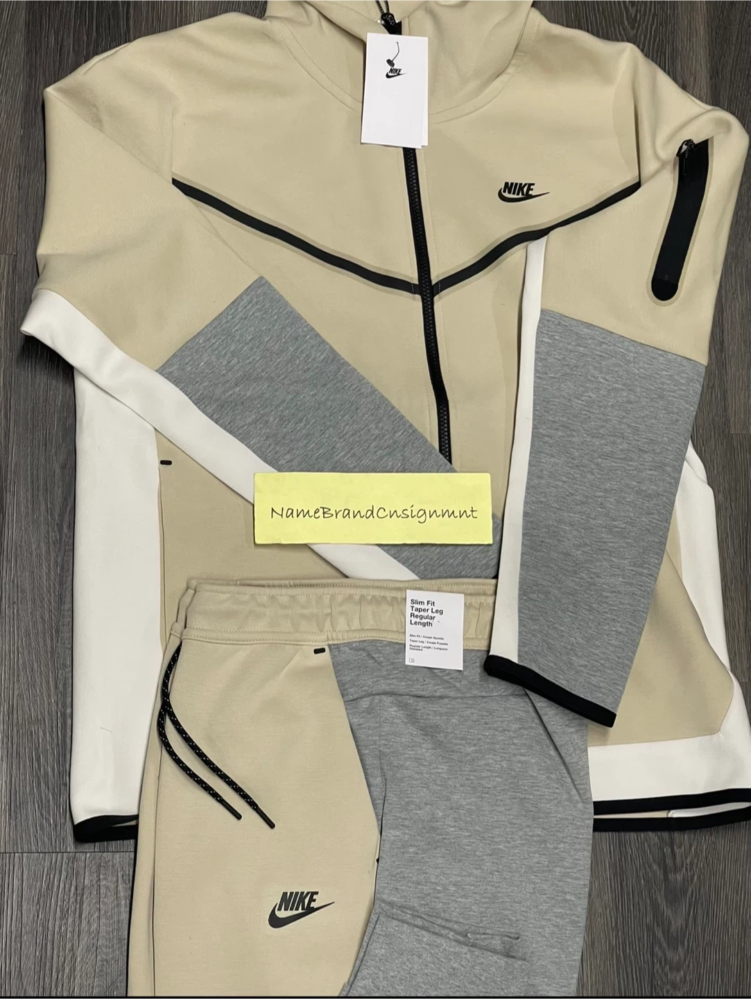 Selling a brand new Nike Tech Fleece set in beige and grey. This set is in great condition and perfect for staying comfy and stylish. The slim fit and tapered leg design add a modern touch. A great addition to your wardrobe!