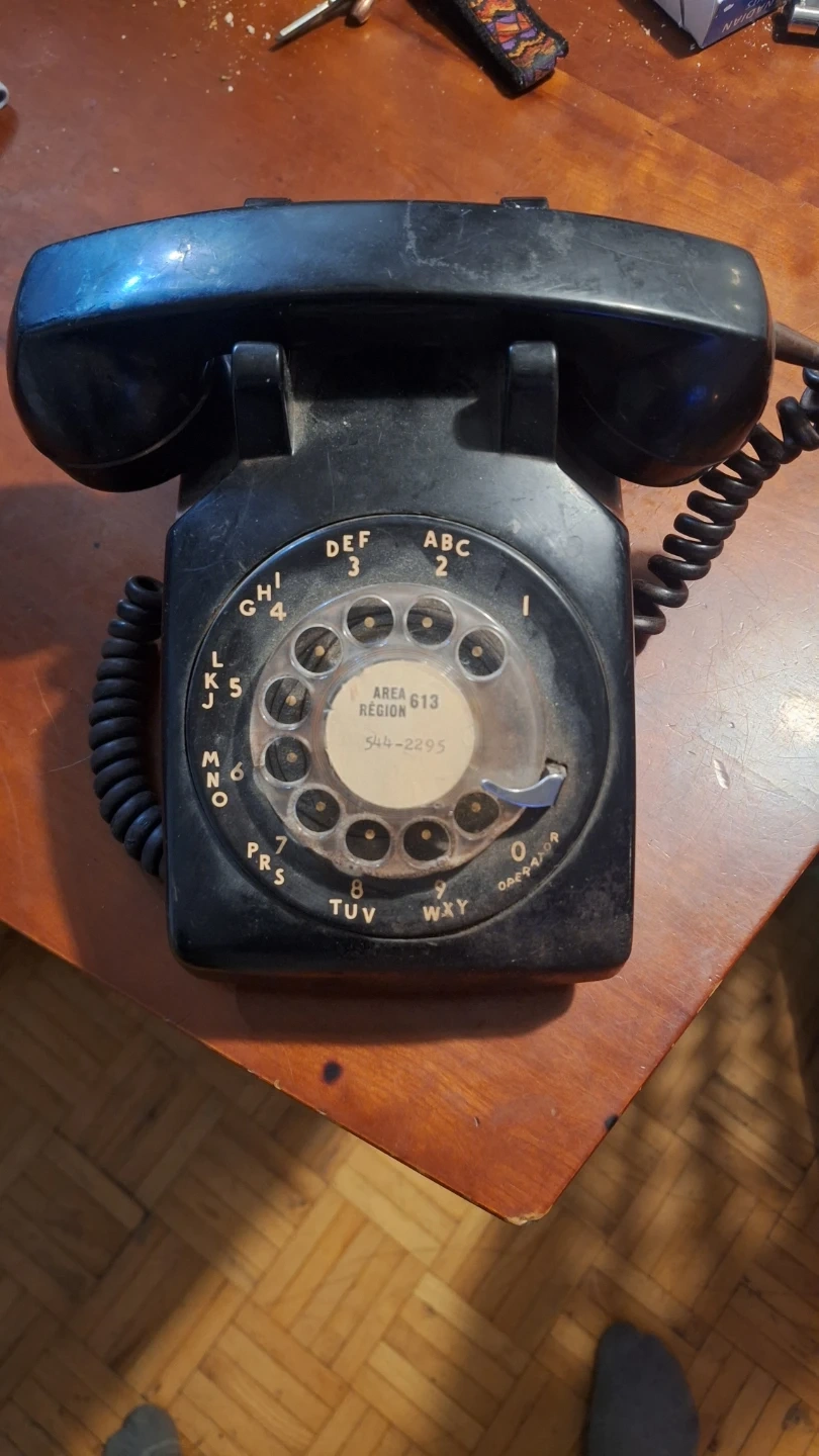 Selling a vintage black rotary phone. It has a classic design and would be a great addition to any collection or as a unique decor piece. It has some signs of wear due to its age, but it's still in decent condition.