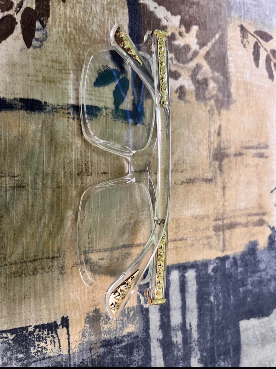 Selling a pair of Chrome Hearts eyeglasses with a clear frame. They feature the signature Chrome Hearts floral design on the sides. Anti-blue light lenses