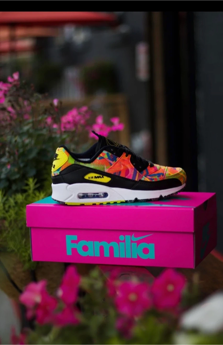 Selling a pair of brand new Nike Air Max 90 Familia sneakers. The shoes feature a vibrant and colourful design. Comes with the original box!