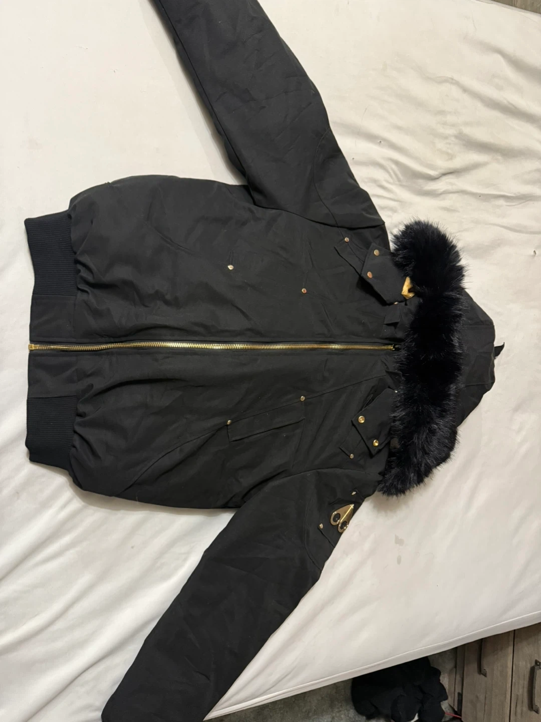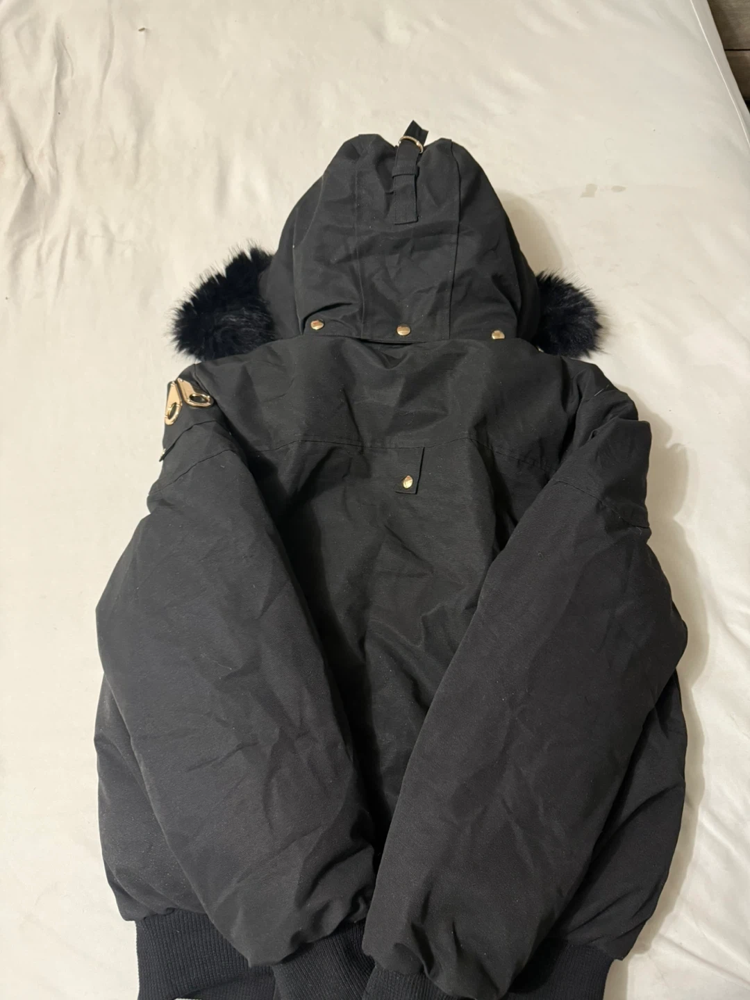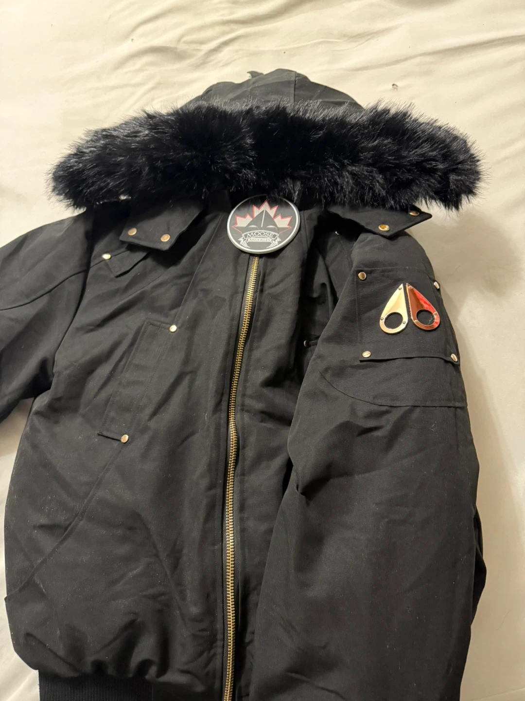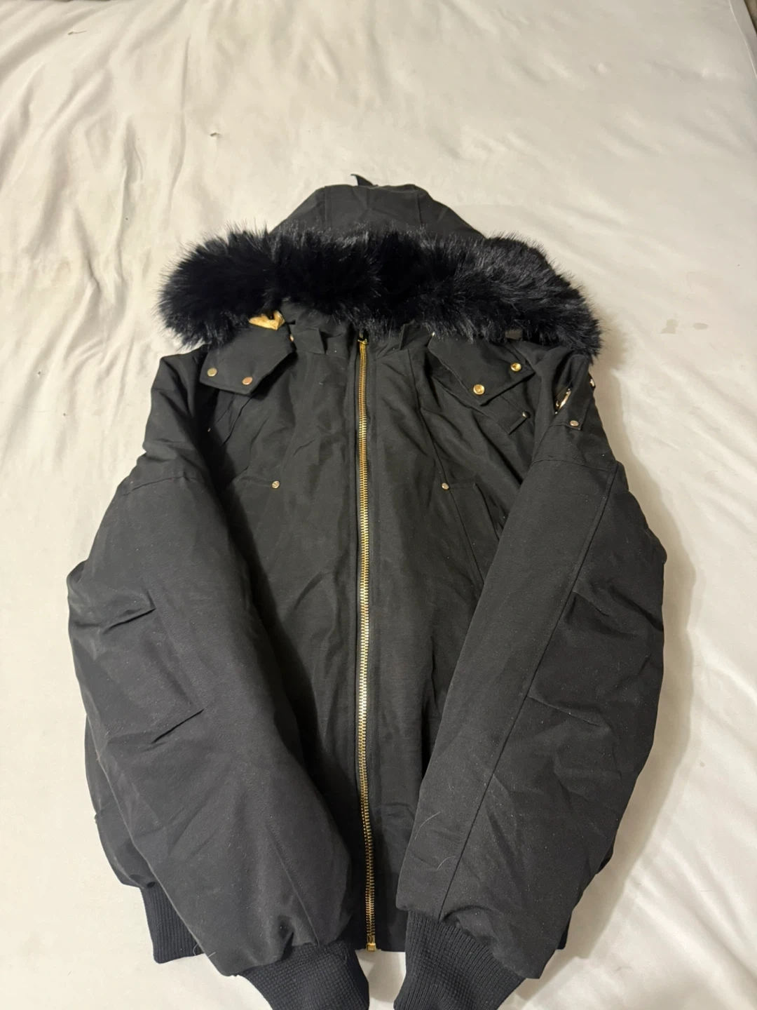 Selling a Moose Knuckles bomber jacket in size L. It's a stylish and warm jacket for the Canadian winter. The jacket features a fur-trimmed hood and the iconic Moose Knuckles logo on the sleeve. Great for keeping warm and looking good!