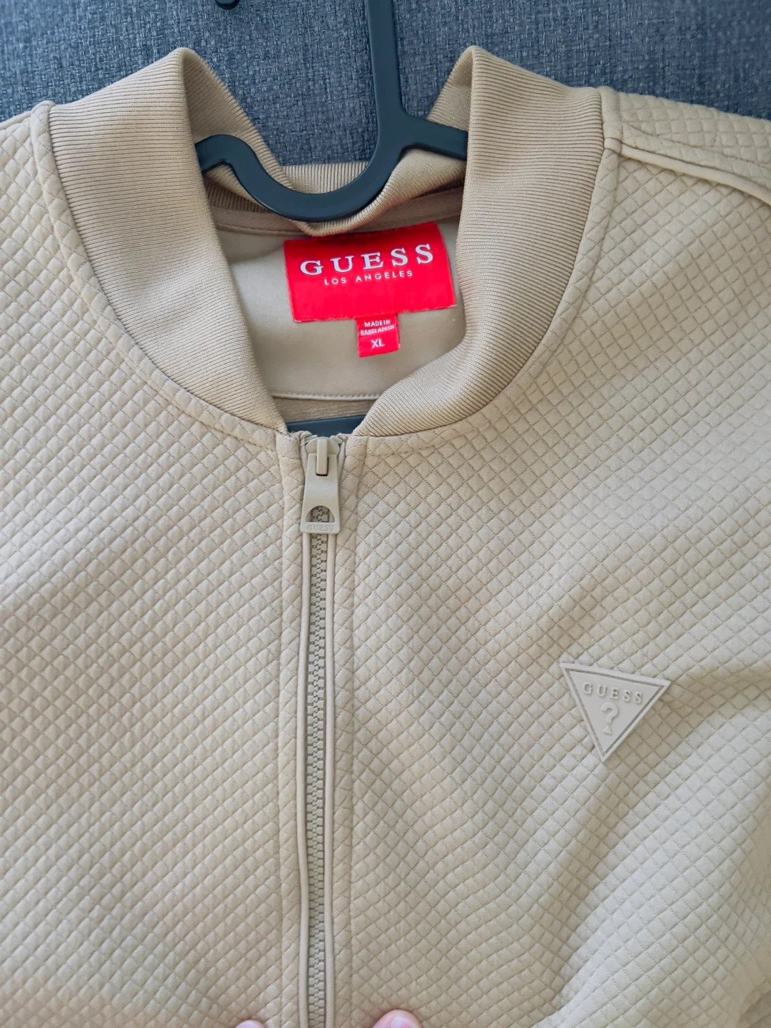 Here's a Guess quilted bomber jacket in size XL. The jacket is a nice neutral beige colour and has a subtle quilted pattern throughout. It's a great layering piece for cooler days!