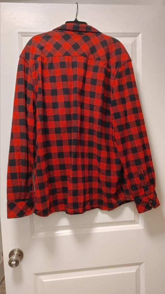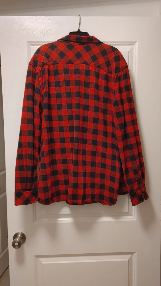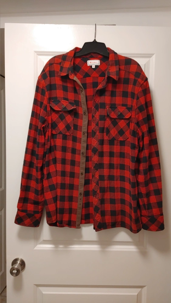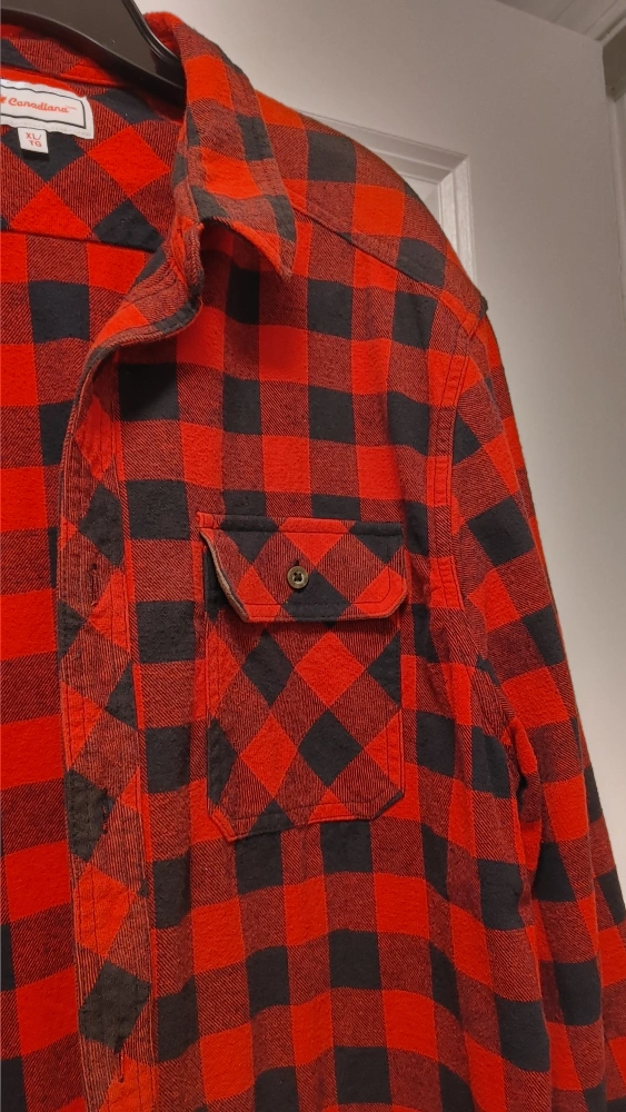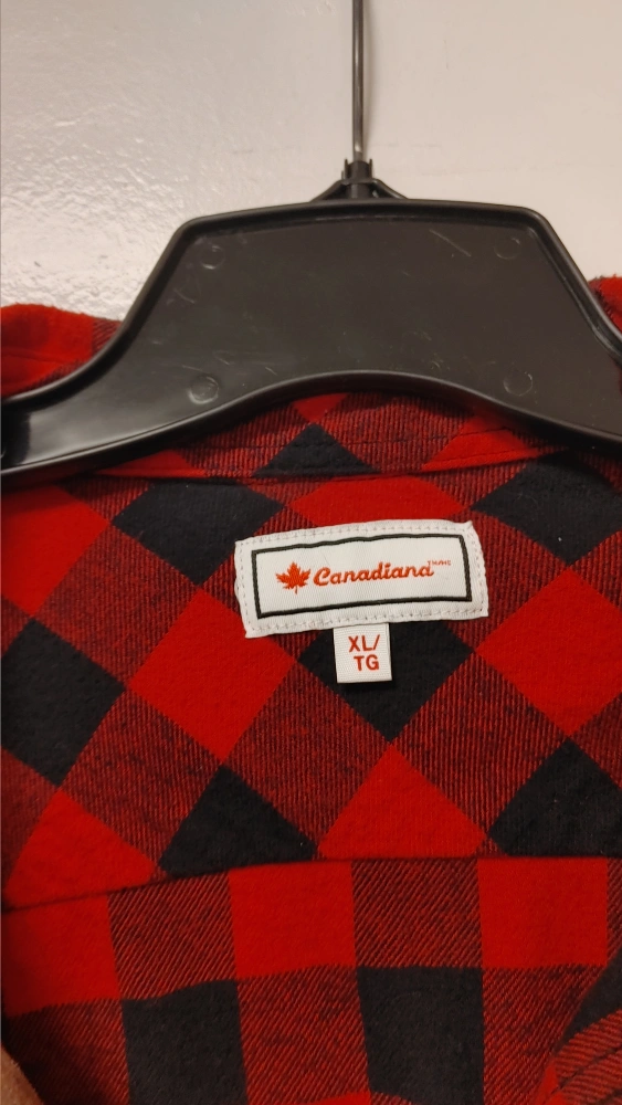 Cozy up in this Canadiana flannel shirt! It features a classic red and black plaid pattern. It's an XL size, perfect for layering or wearing on its own