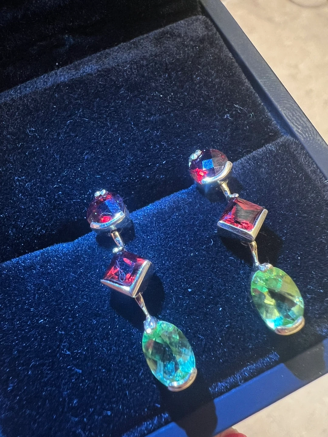 Selling a pair of earrings marked 14K gold. They feature garnets and peridot in a drop style. These are perfect for adding a touch of elegance to any outfit