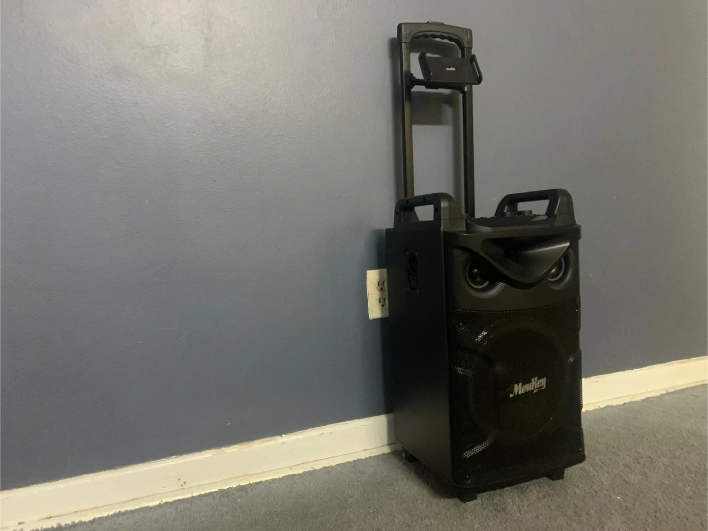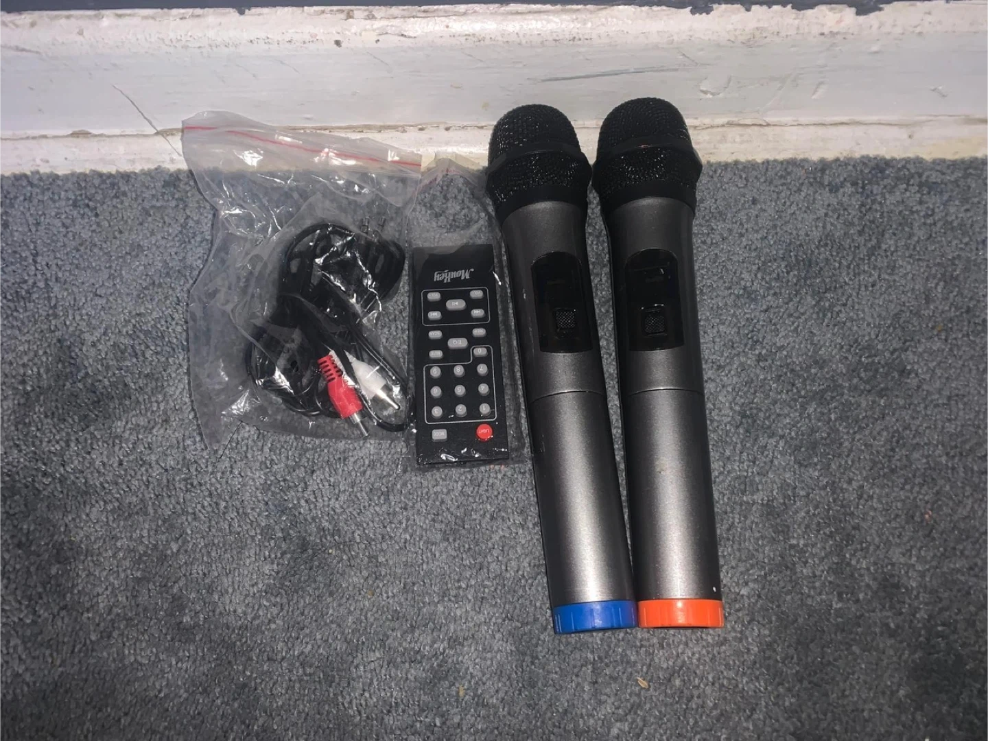 Moukey trolley speaker in great condition! Comes with two microphones and a remote. Perfect for karaoke nights or outdoor events. Feel free to ask any questions!