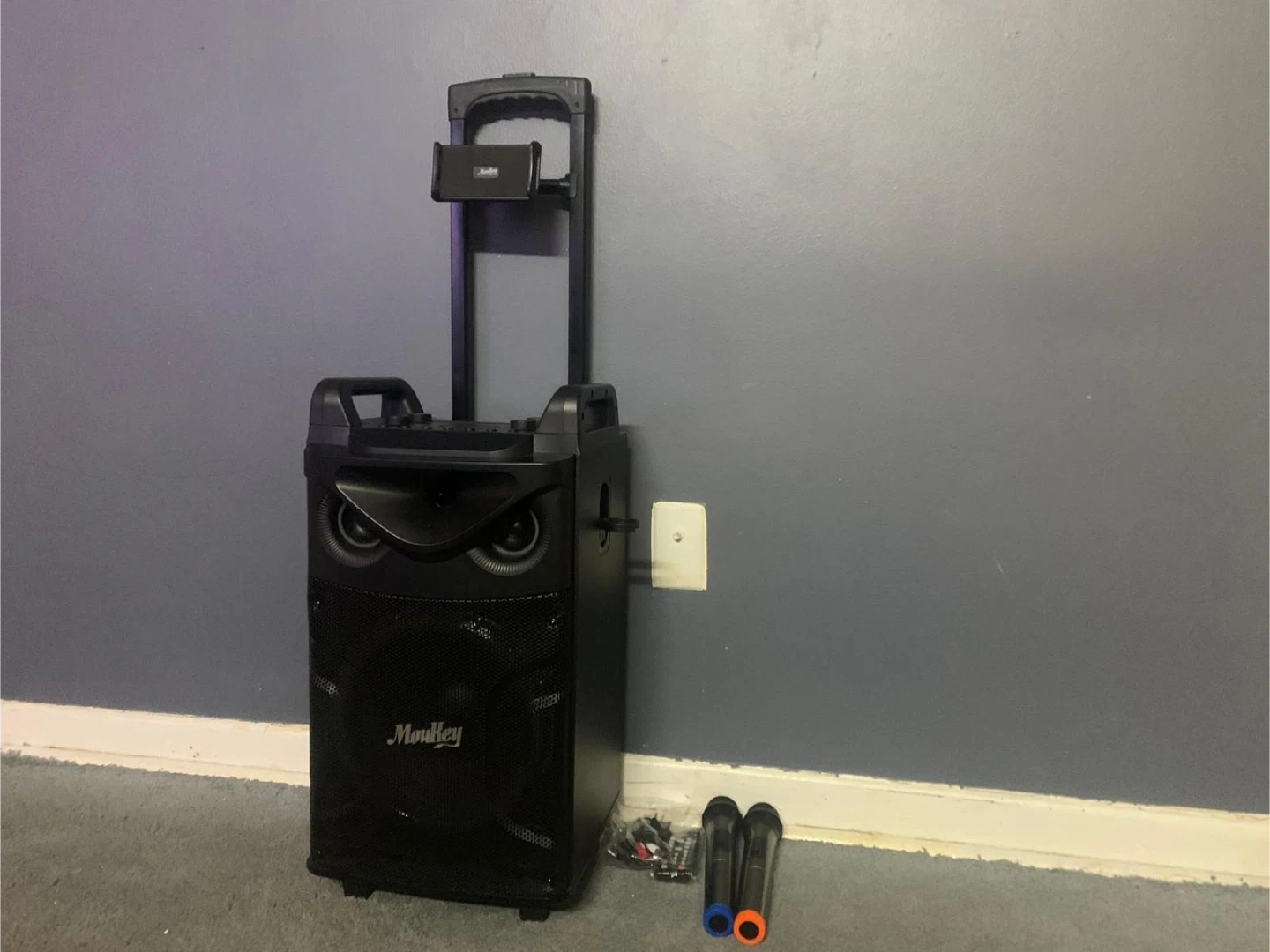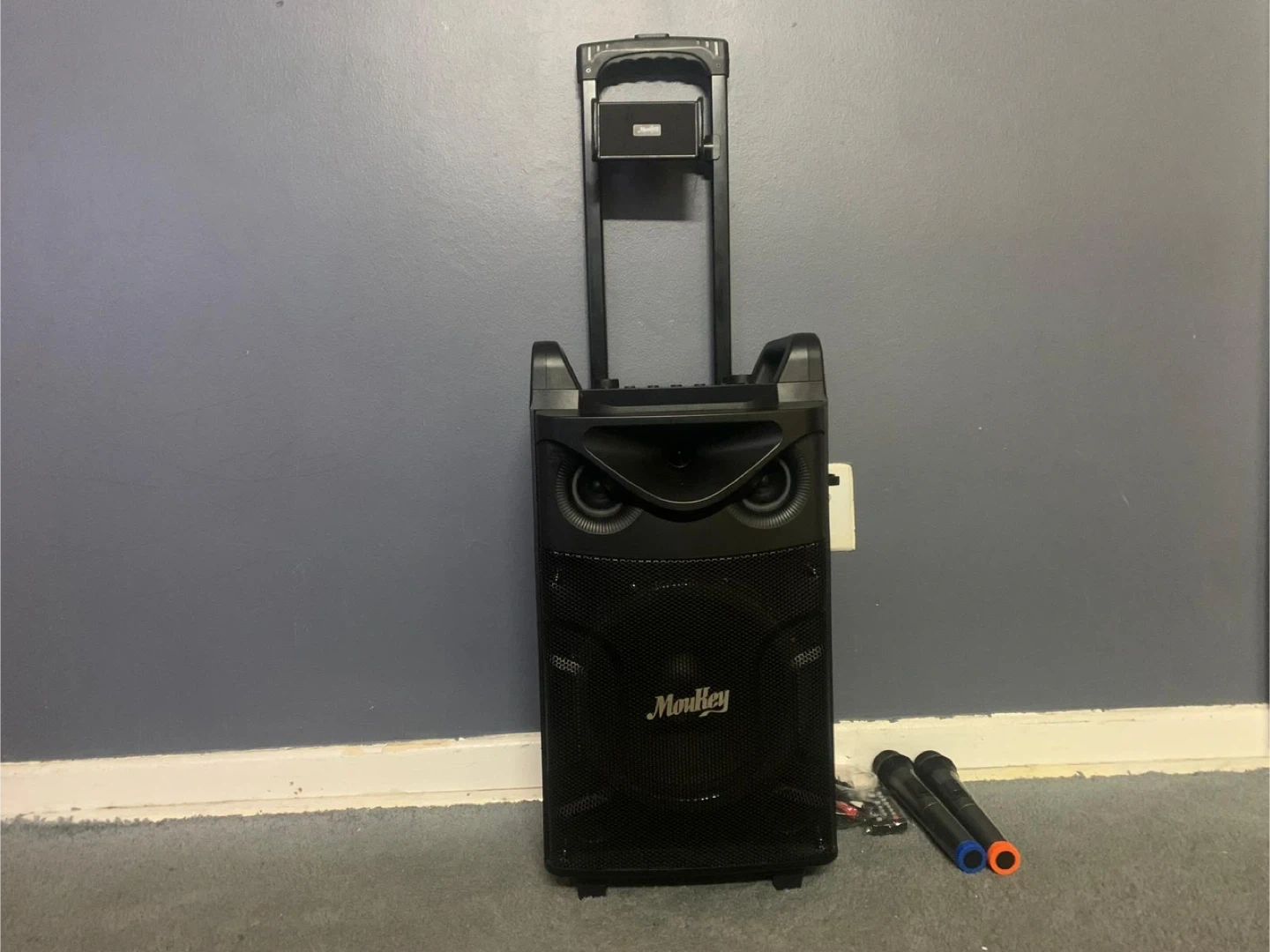 Moukey trolley speaker in great condition! Comes with two microphones and a remote. Perfect for karaoke nights or outdoor events. Feel free to ask any questions!