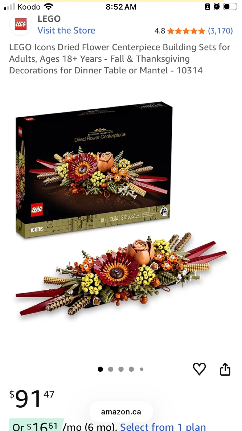 Selling a LEGO Icons Dried Flower Centerpiece Building Set (10314). This set is designed for adults and makes a beautiful fall or Thanksgiving decoration for a dinner table or mantel. It comes with 812 pieces to create a stunning floral arrangement!
