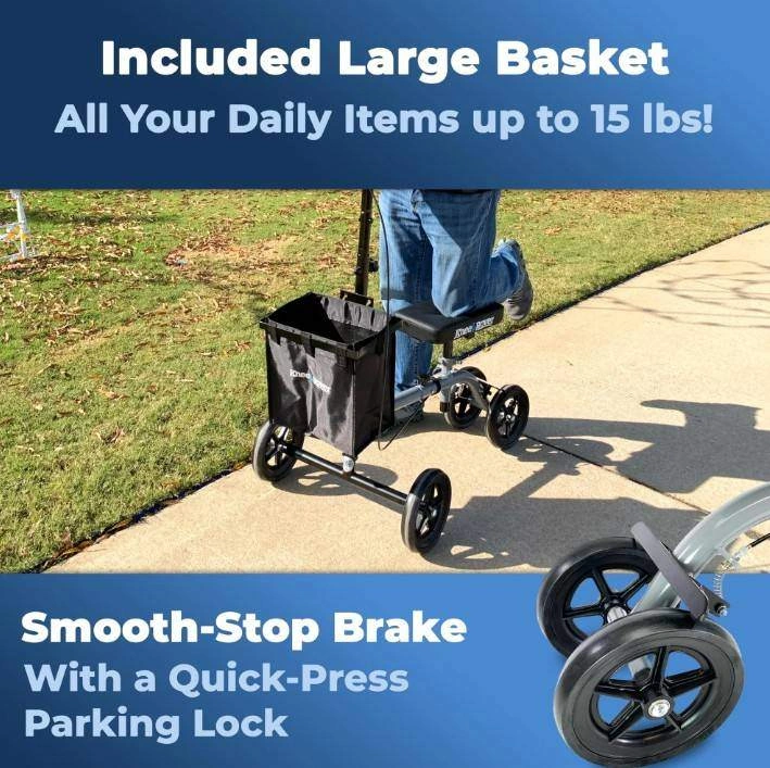• This steerable economy knee walker includes a convenient basket and delivers one of the best knee walker values in the industry. The KneeRover® Ultra is ideal for individuals recovering from a broken foot, broken ankle, broken leg, foot surgery, ankle surgery, leg amputation, or other lower leg injury or medical condition.