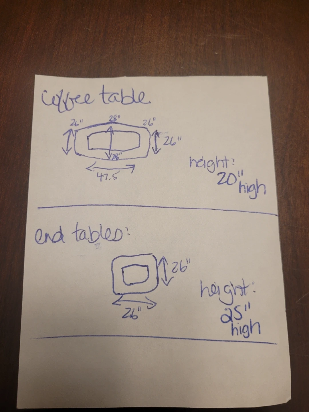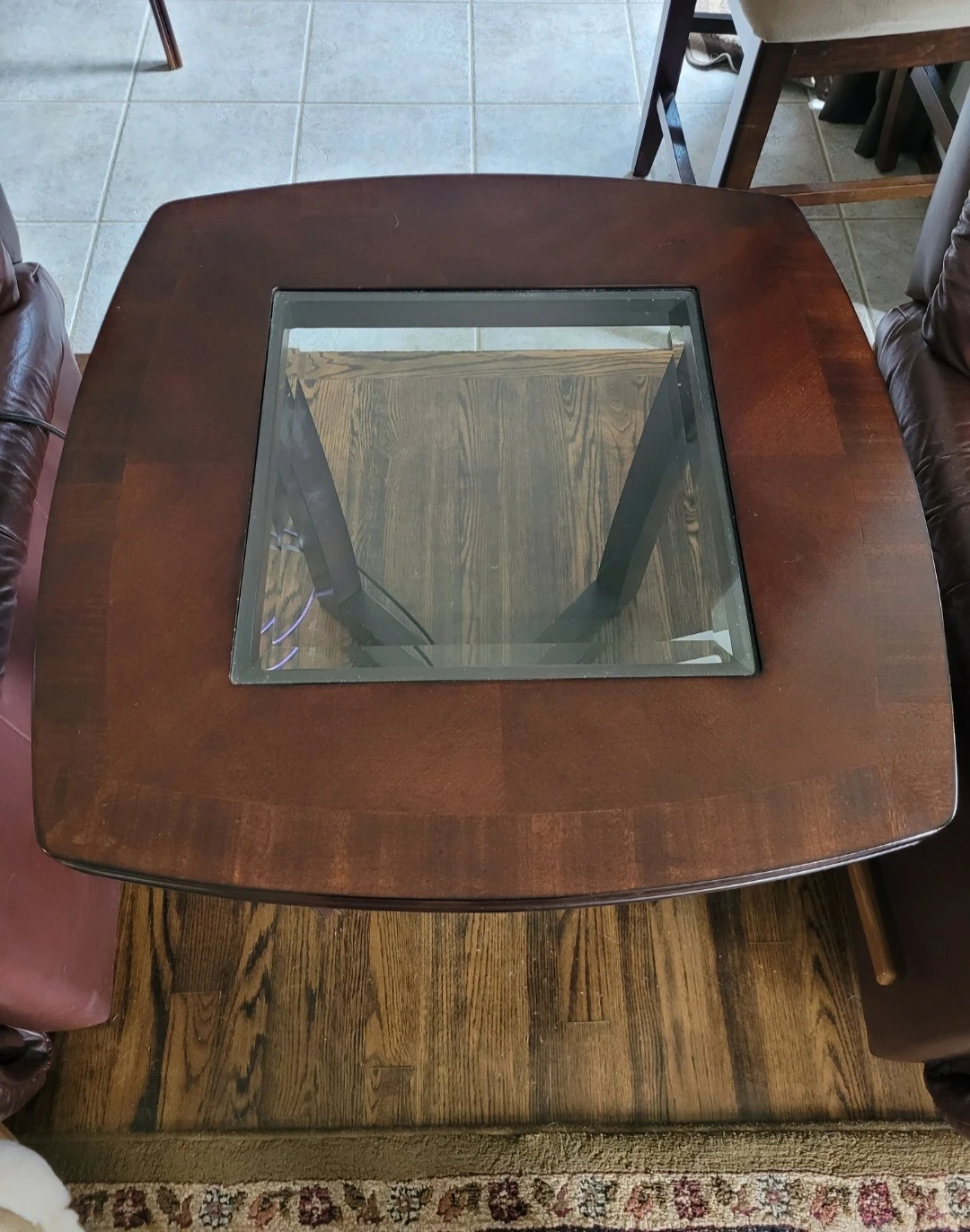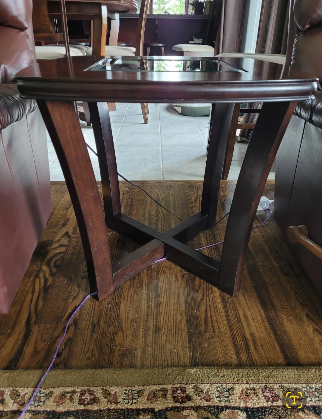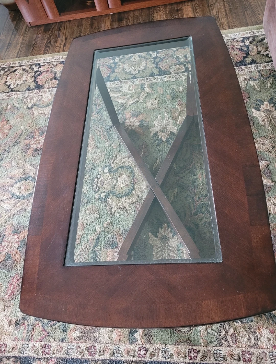 Solid wood with a rich dark finish and elegant glass inset tops. Very sturdy with a modern cross-base design.
