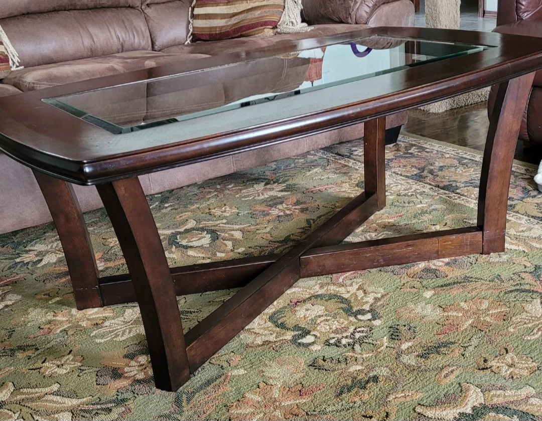 Solid wood with a rich dark finish and elegant glass inset tops. Very sturdy with a modern cross-base design.