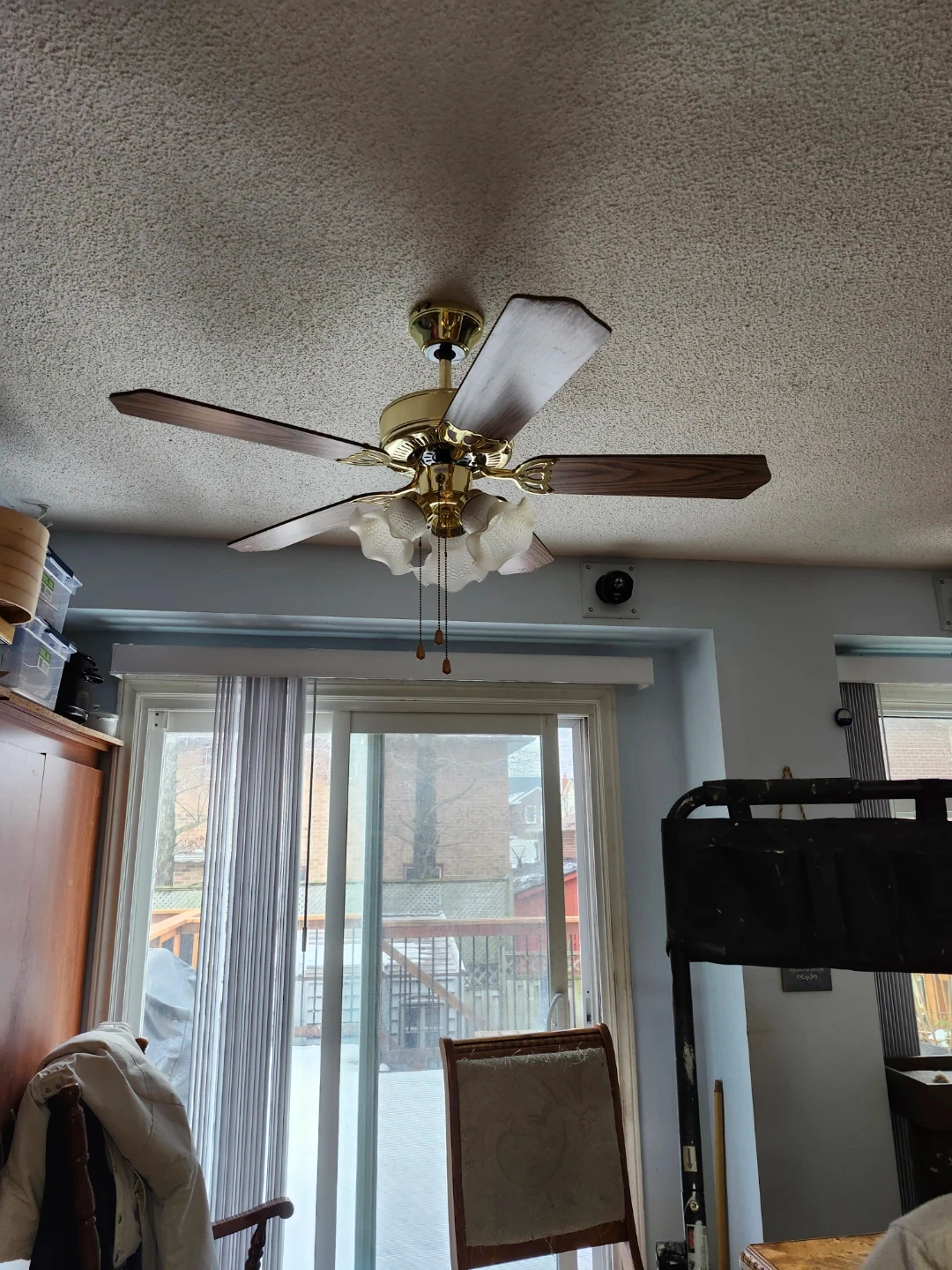 Selling a ceiling fan with a built-in light fixture. It features wooden blades and a gold-tone base. The light fixture has a decorative shade. Perfect for adding a touch of elegance to any room. PLEASE, text only. 9056225663