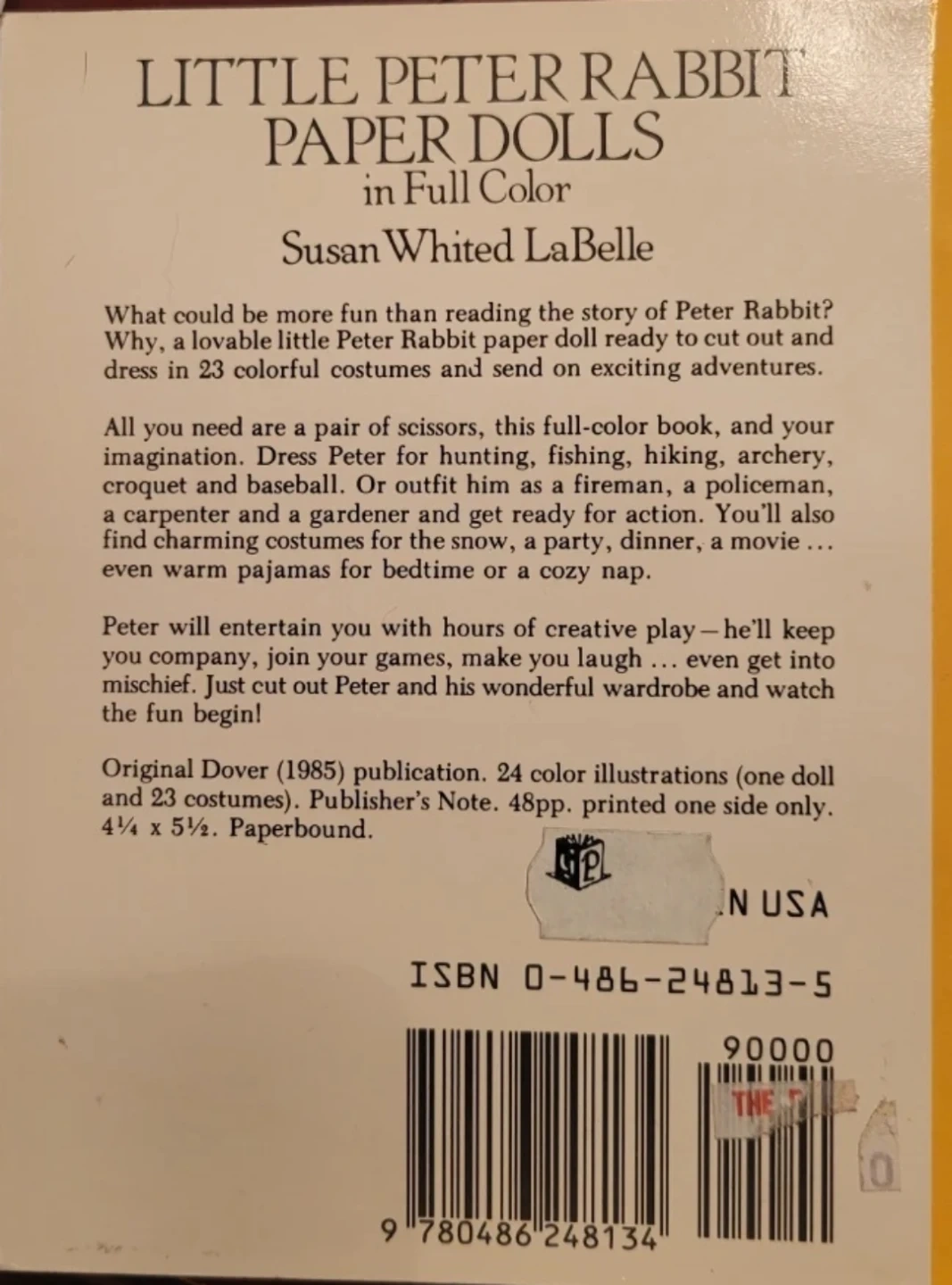 I'm selling a copy of Little Peter Rabbit Paper Dolls in Full Color by Susan Whited LaBelle! This book features 24 colour illustrations on one side only, with 48 pages. It's perfect for anyone who enjoys Peter Rabbit or paper dolls.